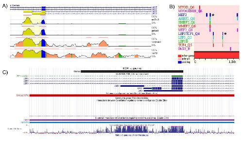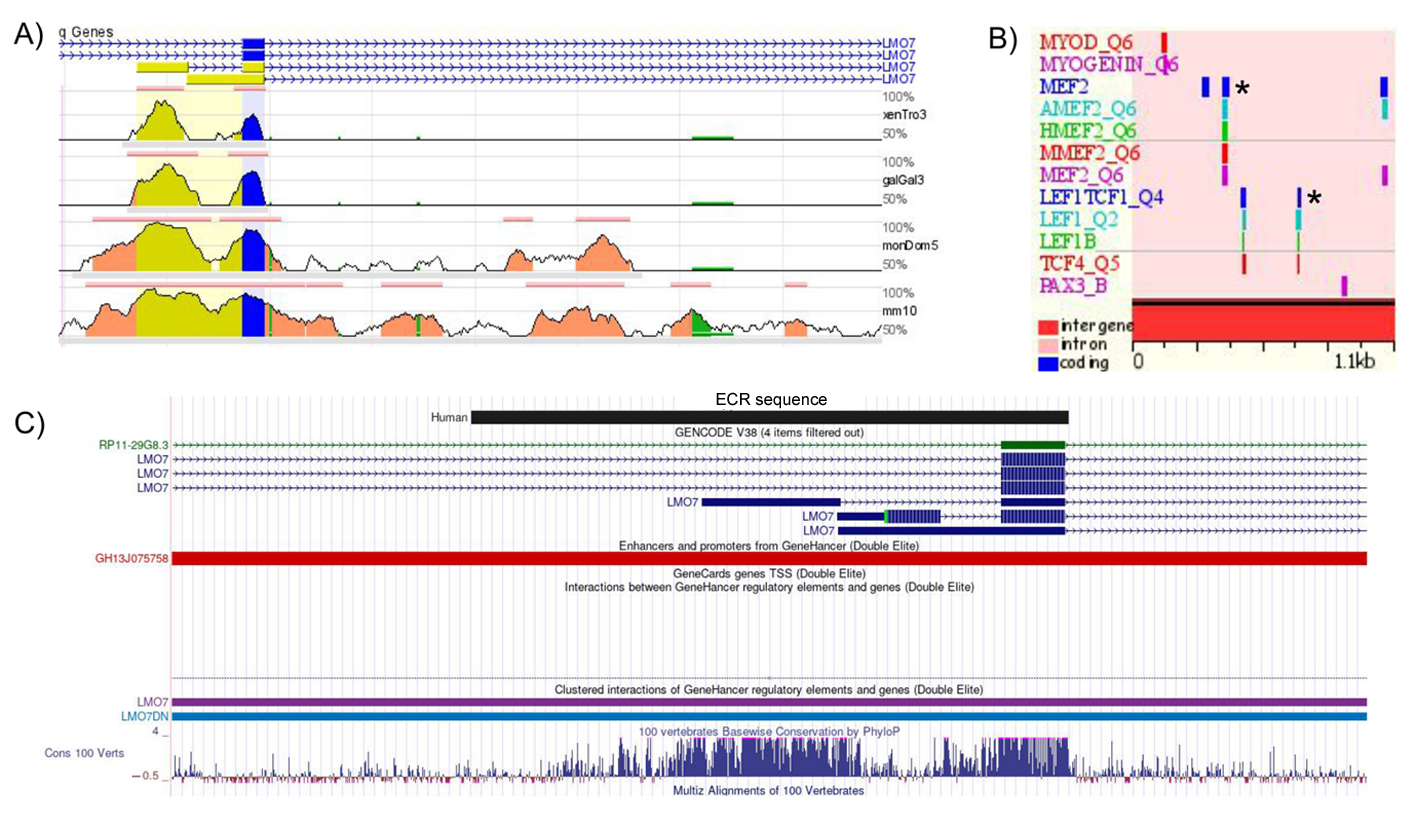 Figure 9. Evolutionarily conserved region (ECR) in the LMO7 loci of human and other vertebrate species with features of a skeletal muscle-specific regulatory element. (A) Conservation profiles of the human LMO7 genomic region (base sequence, on top) in comparison with the mouse (mm10), opossum (momDom5), chicken (Galgal3) and Xenopus (XenTro3) ortholog regions. The 5′–3′ orientation of the human transcripts is denoted by arrow lines. The color codes used to indicate different gene regions are: exons (blue), 5′ UTRs (yellow), introns (pink), repetitive elements (green). Each line represents an alignment, and the vertical height indicates the sequence identity underlying the alignment. (B) The human ECR displays several potential binding sites for key regulators of skeletal myogenesis, such as PAX3, MYOD, MYOGENIN and MEF2. Two sets of the LEF1/TCF4 binding sites are predicted in the human ECR. The asterisk indicates the MEF2 and LEF1/TCF4 binding sites that are conserved in mouse, opossum, chicken and Xenopus. (C) UCSC genome browser display of the BLAT alignment of the human ECR to the human GRCh38/hg38 assembly. The human ECR sequence overlaps with the GH13J075758 promoter/enhancer of the GeneHancer catalog.