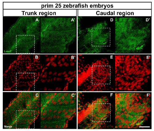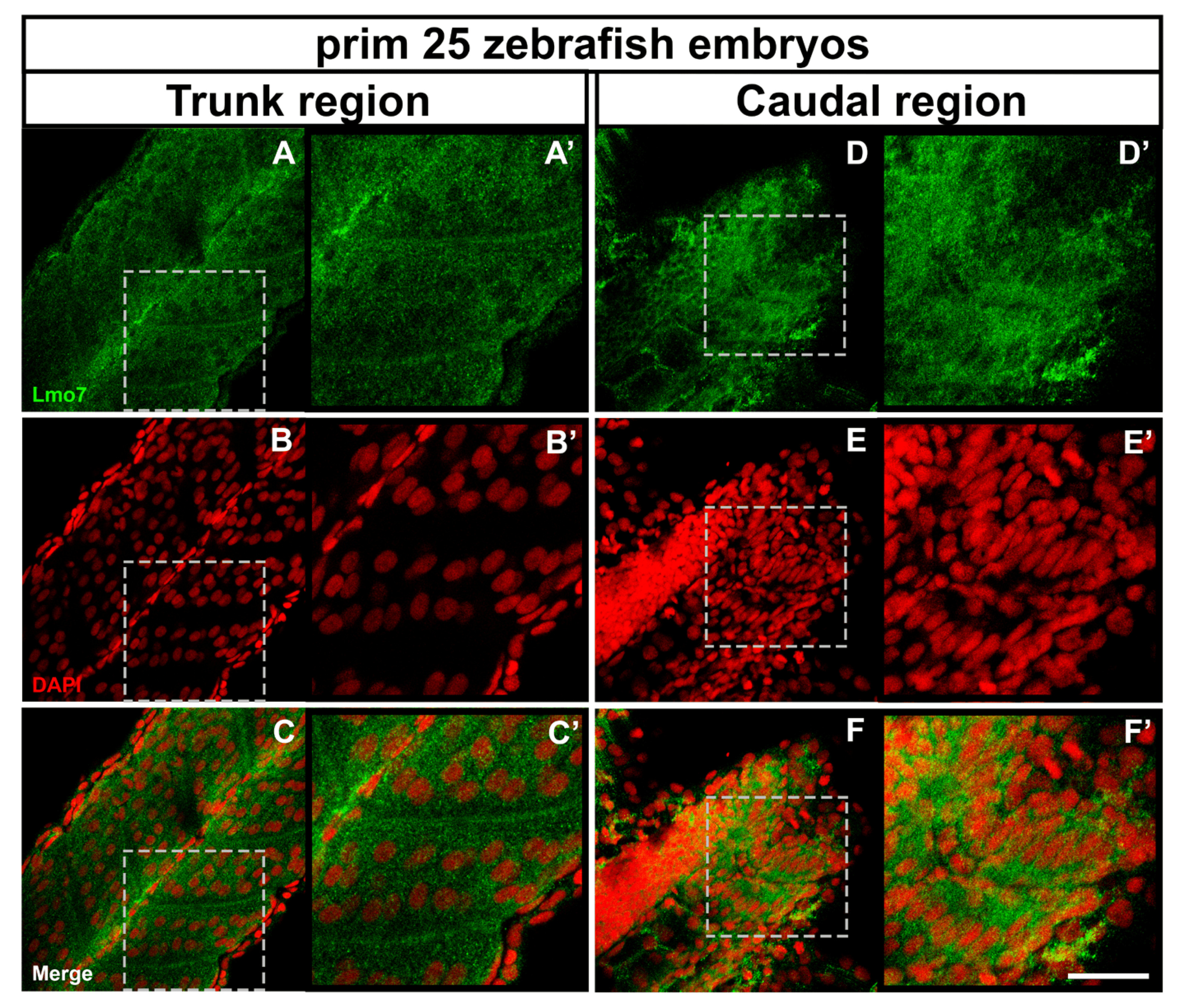 Figure 10. LMO7 distribution in zebrafish embryos. Prim 25 zebrafish embryos were double-labeled with an antibody against LMO7 (green) and the nuclear dye DAPI (red) and analyzed under a confocal laser microscope. The images shown in (A’–F’) are higher magnifications of the dashed areas marked in the corresponding panels (A–F). In somites of the trunk region of prim 25 zebrafish embryos, Lmo7 was found near the septa, the notochord and in the cytoplasm of skeletal muscle progenitor cells (A–C and A’–C’), while in the caudal region, it was found in the cytoplasm and the perinuclear region of muscle cells (D–F and D’–F’). Scale bar = 50 µm.