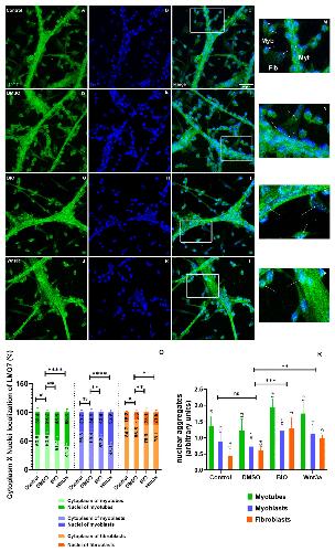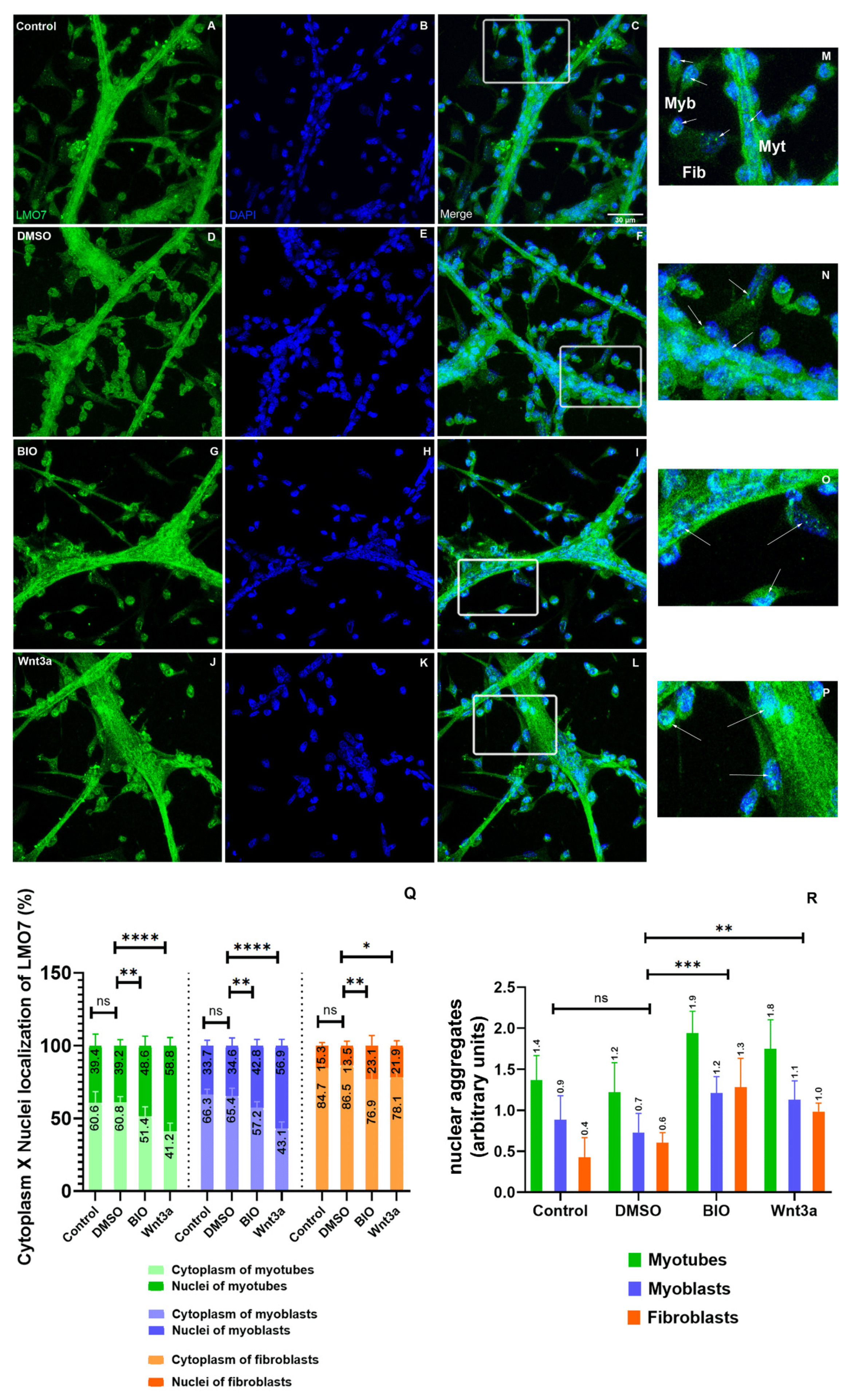 Figure 11. LMO7 intracellular distribution in chicken muscle cells. Chicken myogenic cells were grown for 24 h and treated with DMSO, BIO or Wnt3a for the next 24 h. The cells were double-labeled with an antibody against LMO7 (green) and the nuclear dye DAPI (blue) and analyzed under a confocal laser microscope. Insets (M–P) are higher magnifications of the areas marked in the images C,F,I and L. In the control and DMSO-treated cells, LMO7 is found in the perinuclear region of myotubes and within the nuclei of myoblasts (A–F and M,N). Both BIO and Wnt3a induced an increase in the nuclear labeling of LMO7 (G–L and O,P). Arrows in the insets point to LMO7 localization in myoblasts (Myb), myotubes (Myt) and fibroblasts (Fib). Scale bar for A–L = 20 µm. Quantification of the intracellular localization of LMO7 in the cytoplasm versus the nuclei of cells (Q) and of the fluorescence intensity of LMO7-positive nuclear aggregates (R) is shown. ns = not significant, * = 0.01, ** = 0.07, *** = 0.004, **** = 0.0001.