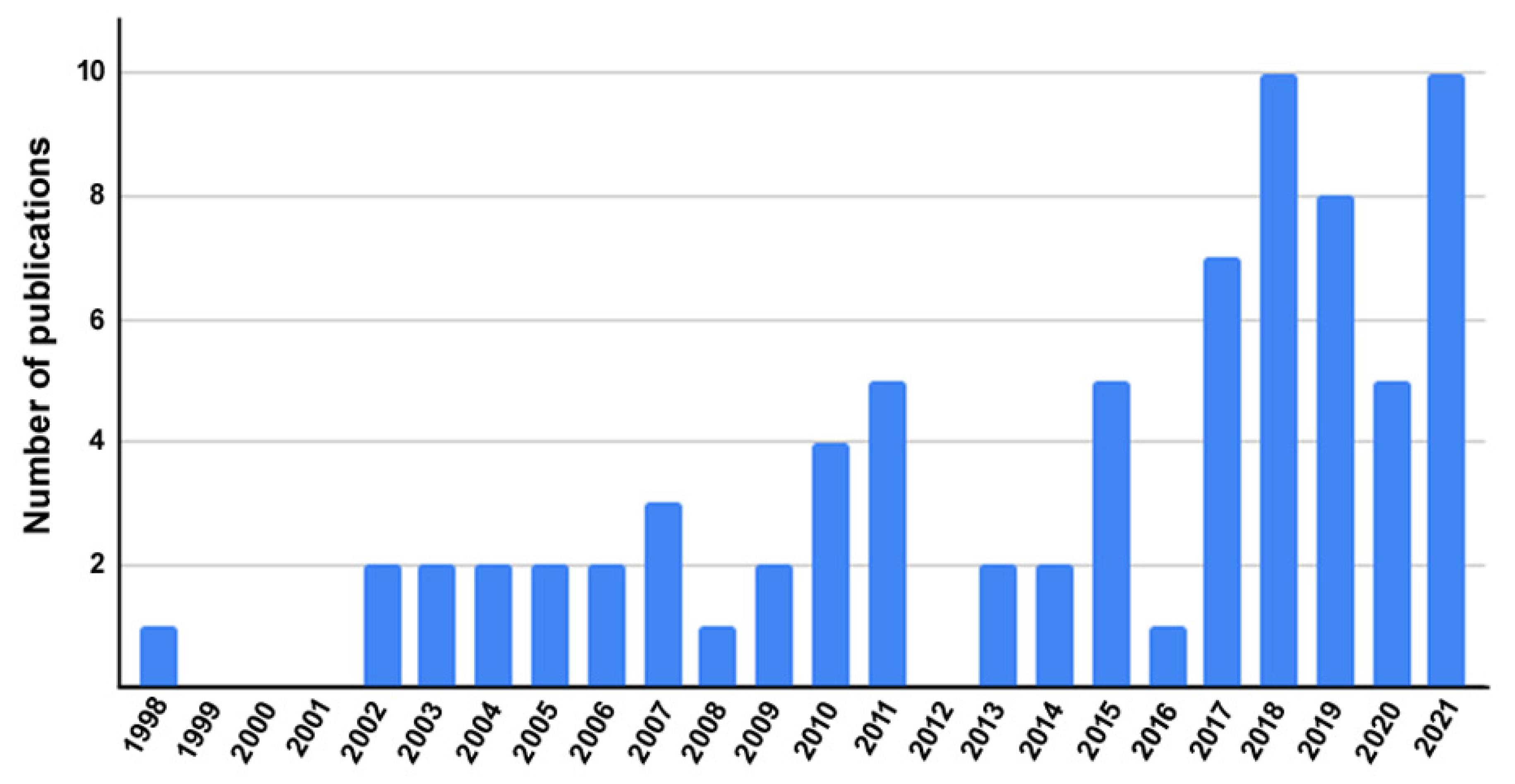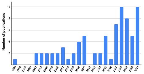 Figure 12. Frequency of LMO7-containing articles published per year. Data retrieved from the PubMed (https://pubmed.ncbi.nlm.nih.gov/) database using descriptors “LMO7” OR “Lmo7” OR “LMO-7” OR “Lmo-7” OR “Lim domain only protein 7”. The search returned 76 articles as of 10 October 2021 for a period that spanned the years 1998 to 2021. From the total of 76 articles, we analyzed the number of LMO7 articles published per year.