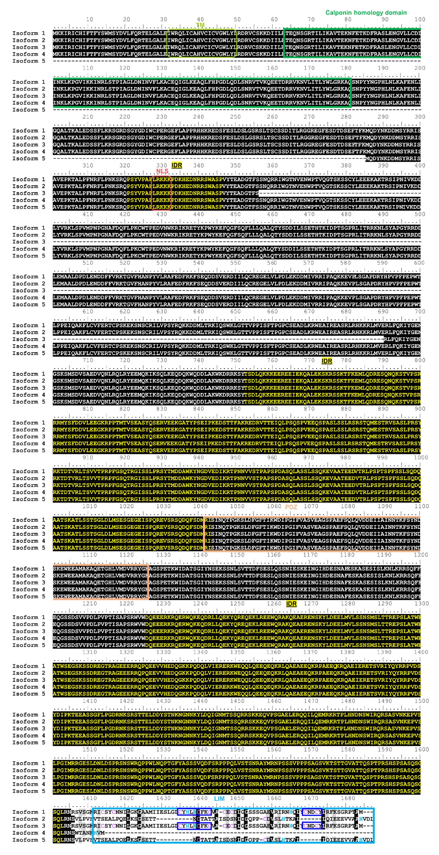 Figure 6. hLMO7 transcript variants show conserved intrinsic disorder but differ in the LIM domain. Alignment of hLMO7 isoforms 1 to 5 (UniProt IDs Q8WWI1-1; Q8WWI1-2; Q8WWI1-3; Q8WWI1-4; Q8WWI1-5, respectively) obtained by Clustal Omega [41]. The predicted domains, motifs and intrinsically disordered regions (IDR) reported in the Database of Disordered Protein Predictions (D2P2) [31] are marked by rectangles and the sequences indicated above. Isoform 5 lacks the putative transmembrane α-helix (TM, predicted by Phobius at https://phobius.sbc.su.se/) and the calponin homology domain (CH). Isoform 3 lacks residues 356–690. The LIM domain is missing in isoform 4. Isoforms 2 and 5 do not have the key zinc ion coordination motifs (dark blue rectangles). Cysteine and histidine residues that might also be involved in Zn(II) binding are marked in purple and blue, respectively. NLS, nuclear localization signal predicted by NLSdb (https://rostlab.org/services/nlsdb/).