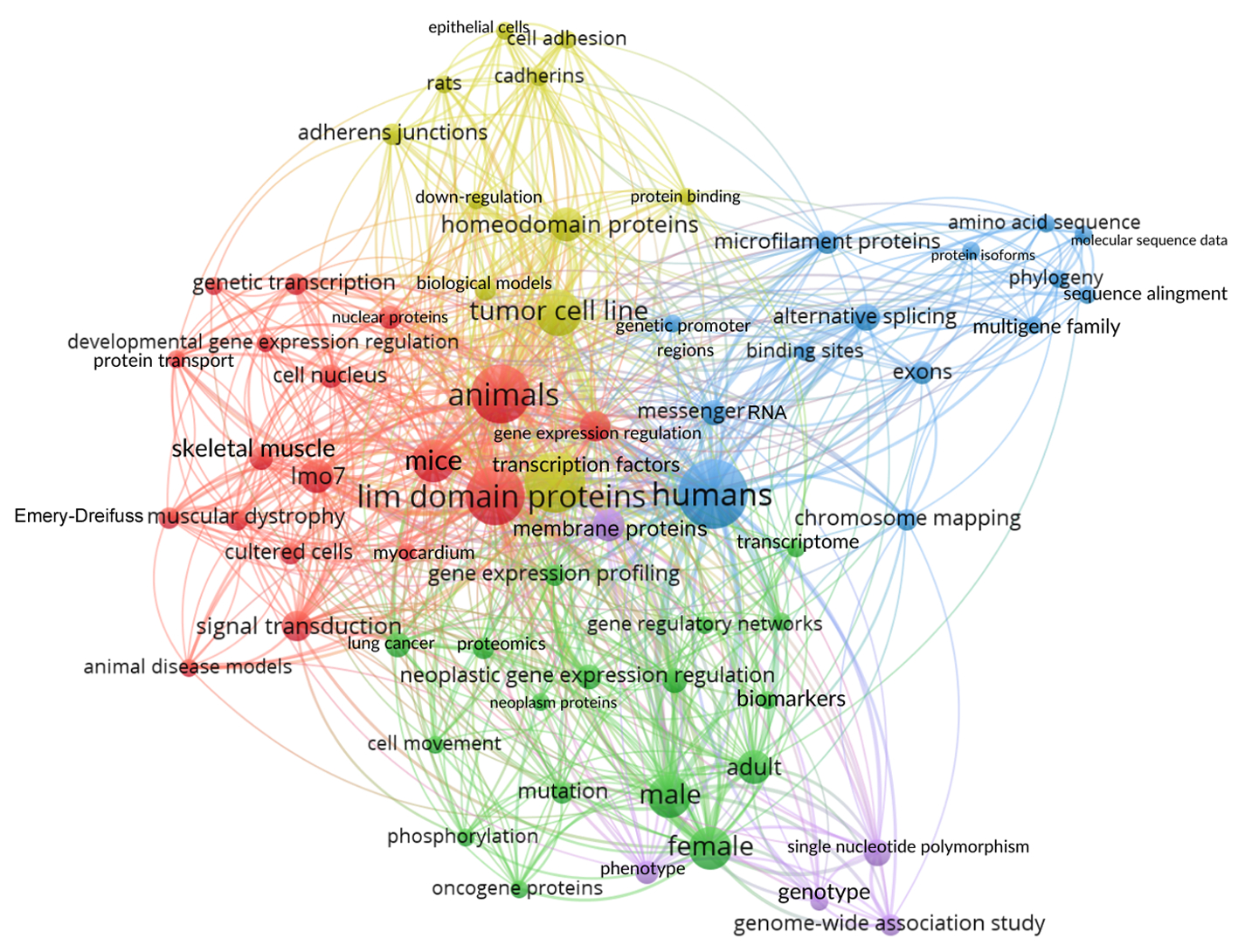 Figure 13. Bibliometric analysis of the co-occurrence relations between scientific terms found in the LMO7 articles. A term map of co-occurrence relations between the scientific terms was created from the bibliometric data retrieved from the titles and abstracts of the published LMO7 articles. The query was performed on October 10, 2021, by using descriptors [lmo7] OR [LMO7] OR [LMO-7] OR [lmo-7] OR [lim domain only protein 7] OR [Lim Domain Only Protein 7]. Five different colors indicate clusters of related terms.