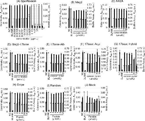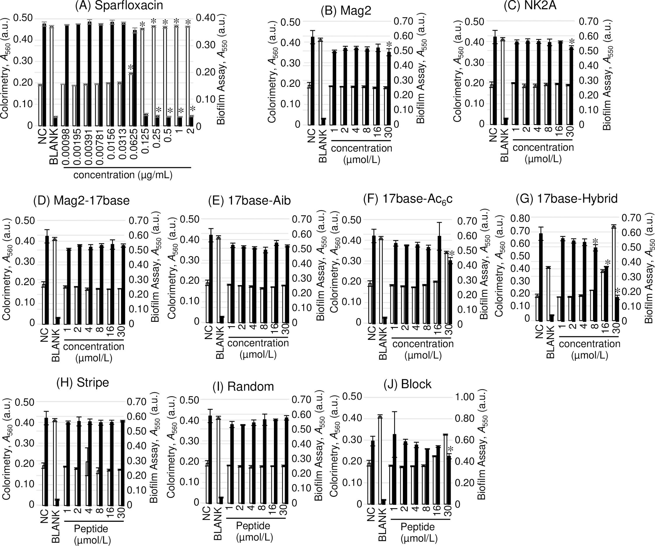 The colorimetric assay (white bar) and the biofilm assay (black bar) were used to evaluate the anti-Mp effects of sparfloxacin (A), and the antimicrobial peptides (AMPs) Mag2 (B), NK2A (C), MAG2-17base (D), 17base-Aib (E), 17base-Ac6c (F), 17base-Hybrid (G), Stripe (H), Random (I), and Block (J). NC means saline negative control and BLANK means the culture medium control without M. pneumoniae inoculation. Error bars indicate ± standard deviations. * indicates the statistical significance at p < 0.005 (ShirleyâWilliamsâ multiple comparison test).