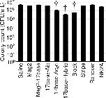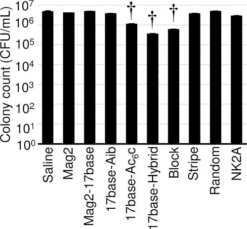 Fig 5. Evaluation of the effects of 17base-hybrid and block on Mycoplasma pneumonia strains Bru, M129-B7, Mac, and M52 using the killing assay.Four strains of M. pneumoniae at 106 CFU/mL were treated with 30 μmol/L AMPs (17base-Hybrid and Block) or saline for 3 days, and inoculated onto PPLO agar in triplicate. The CFU values were determined as the number of surviving cells after 7 or 10 days incubation. Error bars indicate ± standard deviations. * indicates the statistical significance at p < 0.005 (Shirley–Williams’ multiple comparison test) and † indicates the statistical significance vs. saline treatment at p < 0.005 (Welch’s t test).