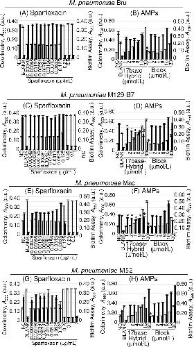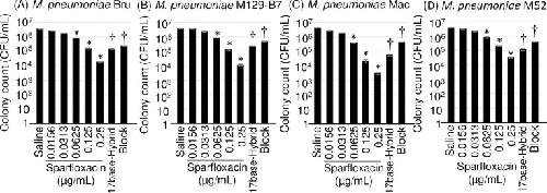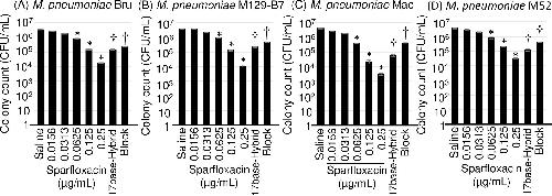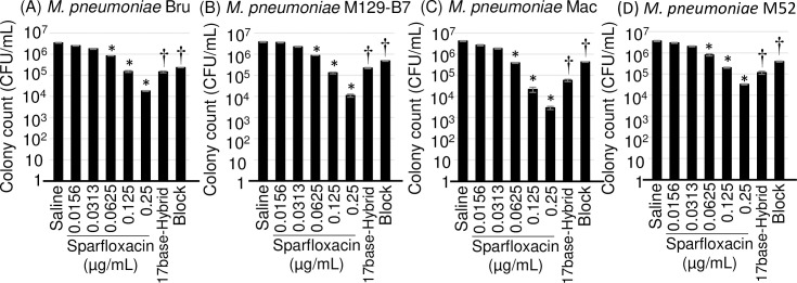 Fig 4. Evaluation of the antimicrobial effects of sparfloxacin and two antimicrobial peptides (AMPs; 17base-hybrid and block) on Mycoplasma pneumoniae strains Bru M129-B7, Mac, and M52.