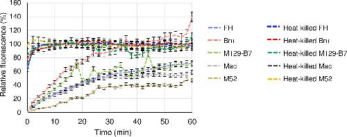 A suspension of live or heat-killed (95°C for 10 minutes) M. pneumoniae strains FH (pale blue or blue dotted-lines), Bru (pale-red or red dotted-lines), M129-B7 (pale-green or green dotted-lines), Mac (grey or black dotted-lines), or M52 (yellow-ocher or yellow dotted-lines) in phosphate buffered saline pH 7.4 was mixed with PI at the final concentration of 5 μg/mL in triplicate, and the intercalate fluorescence (excitation at 535 nm, and emission at 620 nm) were immediately measured in every 2 min. The data was normalised using the averaged fluorescence as 100% between 10 and 20 min by each strain of HKMp. Error bars indicate ± standard deviations.