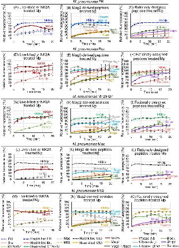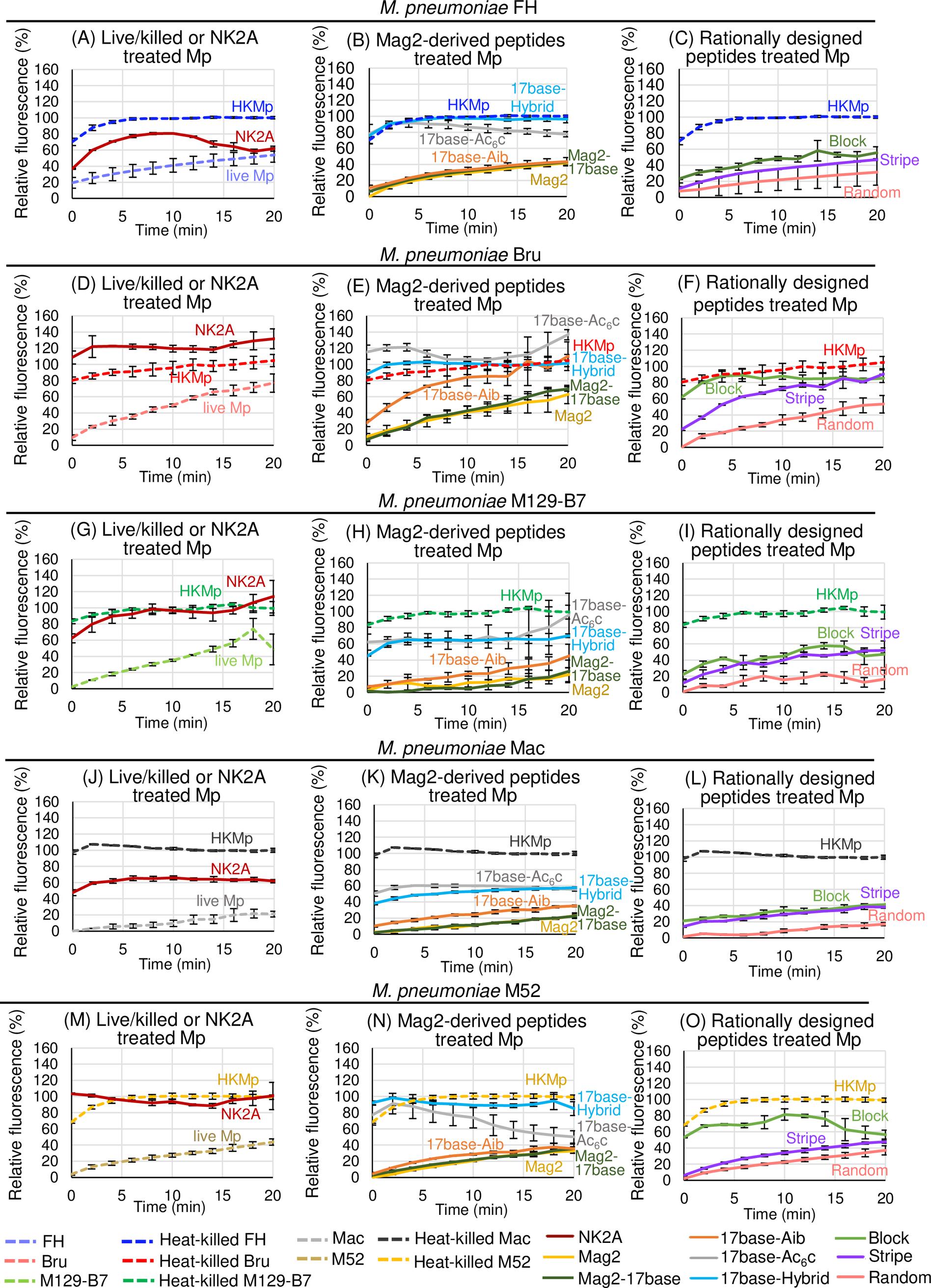 A suspension of live Mycoplasma pneumoniae strains FH (A, B, and C), Bru (D, E, and F), M129-B7 (G, H, and I), Mac (J, K, and L), and M52 (M, N, and O) in phosphate buffered saline was mixed with PI (final 5 μg/mL) and antimicrobial peptides (final 10 μmol/L) in triplicate using NK2A (red-coloured line in panels A, D, G, J, and M), Mag2, Mag2-17base, 17base-Aib, 17base-Ac6c, 17base-Hybrid (yellow, dark-green, orange, grey, and light-blue lines respectively in panels B, E, H, K, and N), Block, Stripe, and Random (green, purple, and pink lines respectively in panels C, F, I, L, and O). The intercalate fluorescence of PI (excitation at 535 nm, and emission at 620 nm) were immediately measured in every 2 min. For the reference, the live or heat-killed M. pneumoniae (live Mp or HKMp) were also used without any antimicrobial peptides; live Mp of strains FH, Bru, M129-B7, Mac, and M52 were depicted by pale-blue, pale-red, pale-green, grey, yellow-ocher dotted-lines respectively in panels A, D, G, J, and M, and HKMp of strains FH, Bru, M129-B7, Mac, and M52 were depicted by blue, red, green, black, yellow dotted-lines respectively in all panels. The data was normalised using the averaged fluorescence from 10 to 20 min by each strain of HKMp. Error bars indicate ± standard deviations.