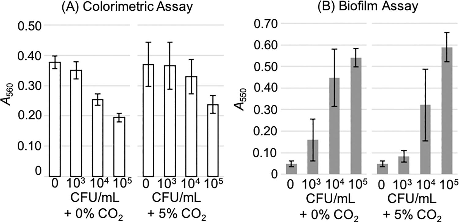 Mycoplasma pneumoniae FH was inoculated at 103, 104, and 105 CFU/mL in a 96-well plate and cultivated with 0% or 5% CO2. The growth was analysed by measuring the absorbance at 560 nm in the colorimetric assay (A) and at 550 nm in the biofilm assay (B). Error bars indicate ± 3 standard deviations.