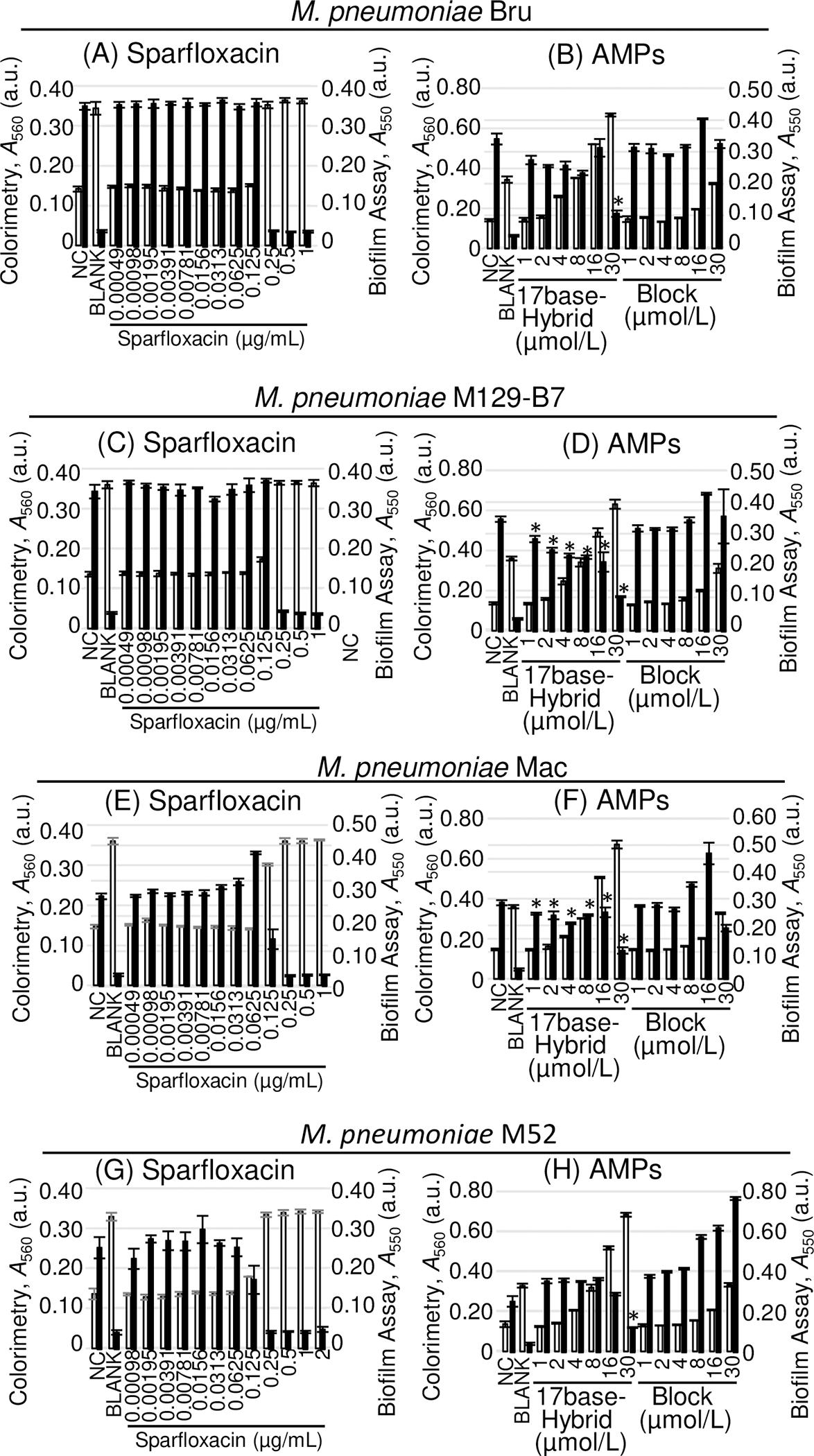 The results of the colorimetric assay (white bars) and biofilm assay (black bars) are depicted. M. pneumoniae Bru (A, B), M129-B7 (C, D), Mac (E, F) and M52 (G, H) were used for the tests, and sparfloxacin (A, C, E, G) was used as a positive control. The anti-Mp effects of 17base-Hybrid and Block (B, D, F, H) were verified. NC indicates saline negative control, and BLANK indicates the culture control without M. pneumoniae. Error bars indicate ± standard deviations. * indicates the statistical significance at p < 0.005 (Shirley–Williams’ multiple comparison test).