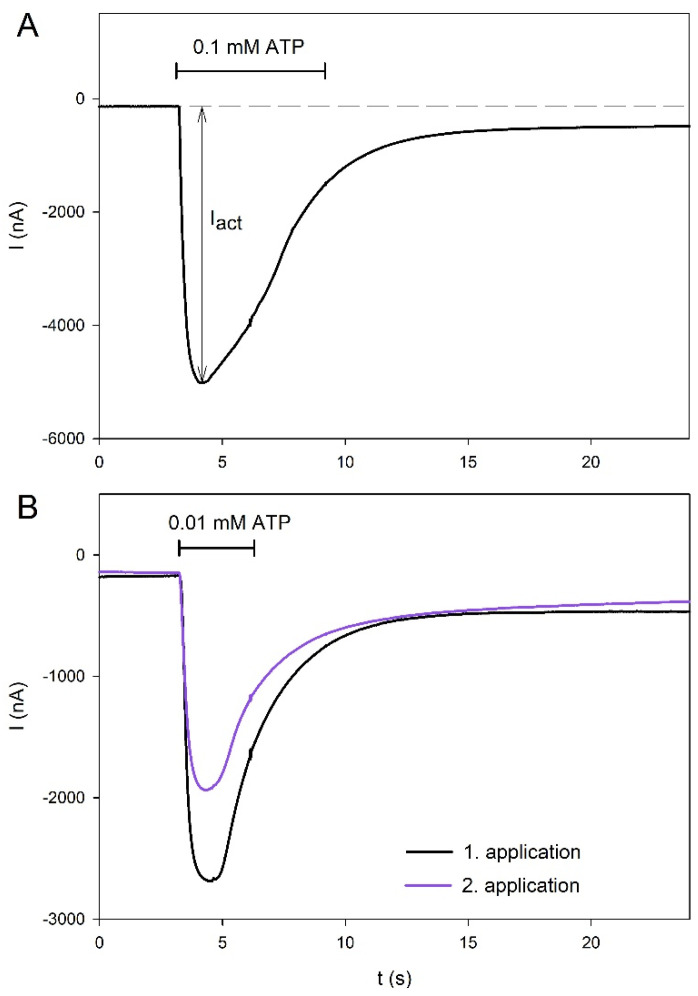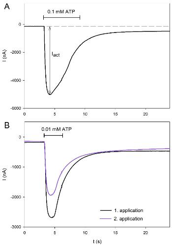 Figure 1. Examples of hP2X5FL-mediated current traces in X. laevis oocytes elicited by ATP. ATP was applied for 6 s (A) or 3 s (B) at the indicated ATP concentration and for the duration indicated by the horizontal line. In (B), a 2 min washout period was inserted between the first and second ATP applications.