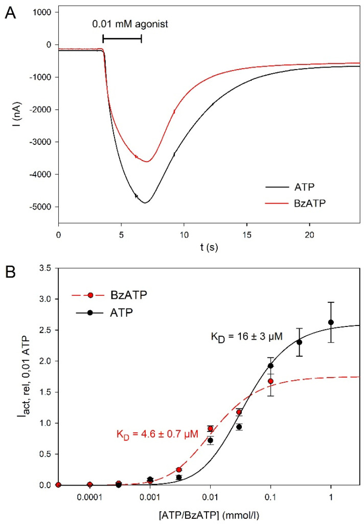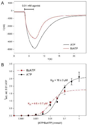 Figure 2. Agonist dependence of hP2X5FL-mediated ion currents in X. leavis oocytes. (A) Examples of current traces elicited consecutively by ATP or BzATP as indicated in the same hP2X5FL-expressing oocyte. (B) Concentration dependence of currents evoked by the indicated agonist. Iact,rel,0.01ATP was calculated according to Equation (1) and the approximation was performed using Equation (2). Data are means ± SEM from of 4–12 oocytes.