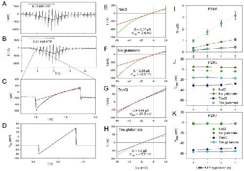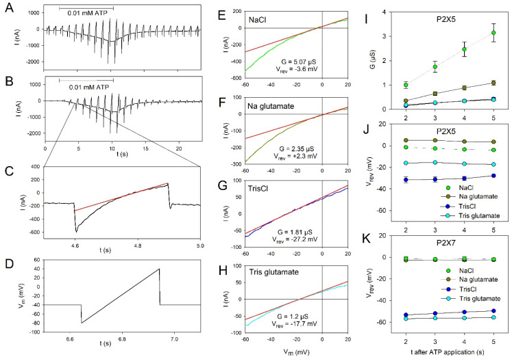 Figure 3. Permeation behavior of oocyte-expressed hP2X5FL ion channels. Time course of ramp currents during voltage ramps applied every second before and during application of 0.01 mM ATP for the time indicated by the horizontal bar before (A) and after (B) subtraction of the resting ion currents. The bathing solution was a NaCl-based Ringer’s solution. (C) Current ramp from a section of B as indicated. The red straight line is the linear fit of the current around the reversal potential. (D) Voltage ramp protocol. (E–H) Examples of ramp currents induced by 0.01 mM ATP in bathing solutions with the indicated main extracellular ions. The ramp current recorded before the ATP application was subtracted. The red lines indicate the linear approximation of the current–voltage dependence near I = 0, from which the slope conductance G and the reversal potential Vrev are obtained as indicated. Dependence of G (I) and Vrev (J,K) on the extracellular ions of hP2X5FL (I,J) and hP2X7 (K) expressing oocytes. All mean values are significantly different except the reversal potentials in NaCl and Na glutamate solution for hP2X7 expressing oocytes. Means from 13–37 oocytes.