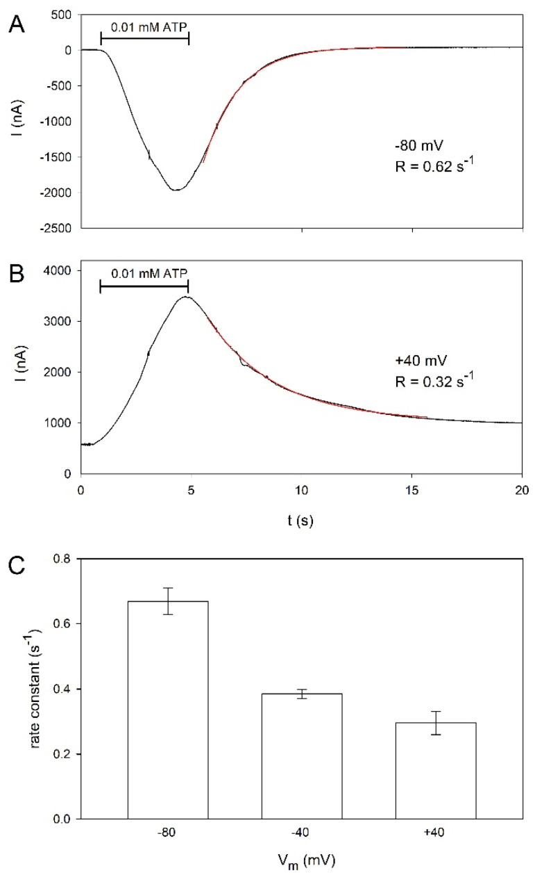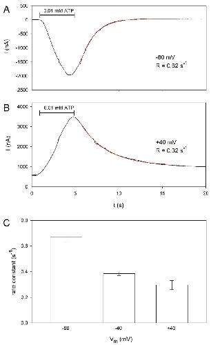 Figure 4. Voltage dependence of oocyte-expressed hP2X5FL ion channels. Characteristic example of hP2X5FL-dependent current evoked by 0.01 mM ATP for the time indicated by the horizontal bar at a membrane potential of −80 mV (A) or +40 mV (B), respectively. The exponential fits of the deactivation time courses according to eq. 3 are plotted as red lines, with the determined rate constants as indicated. (C) Statistics of the effect of the membrane potential on the deactivation rate constant. All mean values are significantly different from each other. Means are from 9–19 oocytes.