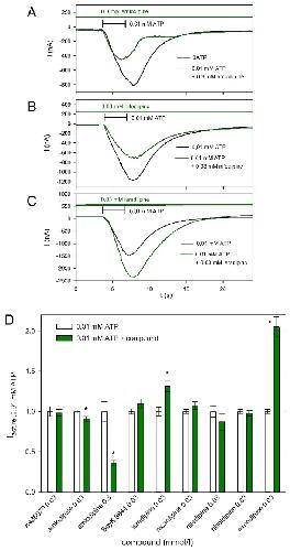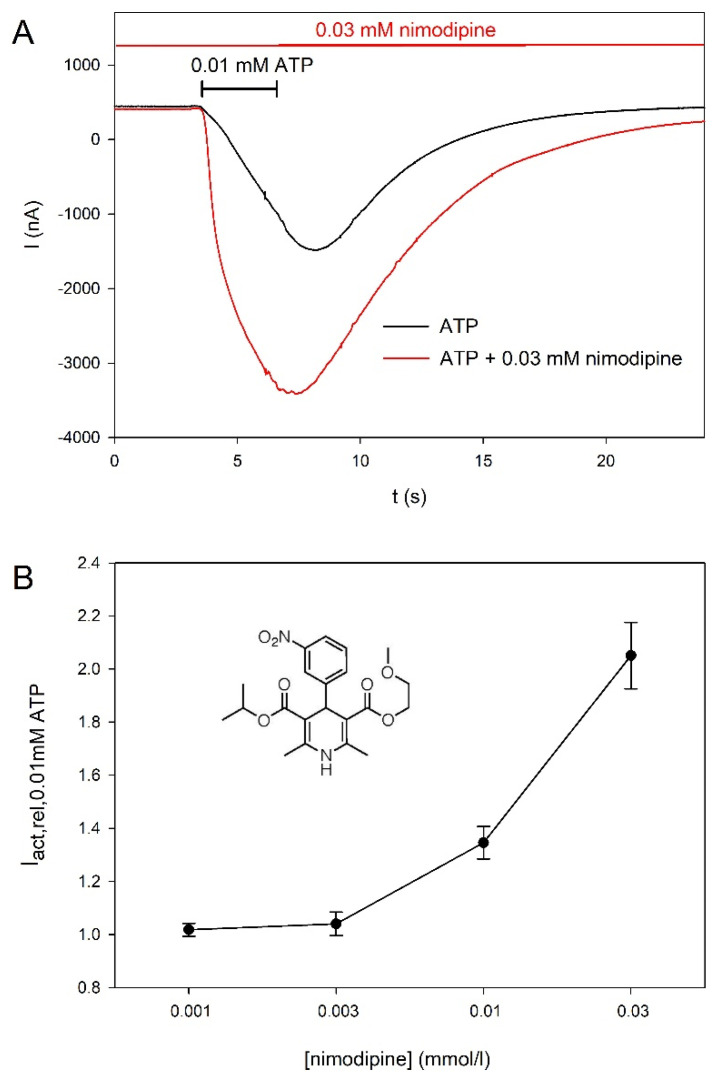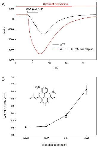 Figure 6. Concentration-dependent effect of nimodipine on hP2X5FL-mediated currents. (A) Example current traces consecutively evoked by ATP and ATP + nimodipine. (B) Concentration dependence of the effect of nimodipine on ATP-elicited hP2X5FL-mediated currents. Means are from of 6–40 oocytes. The structure of nimodipine is shown in the inset.