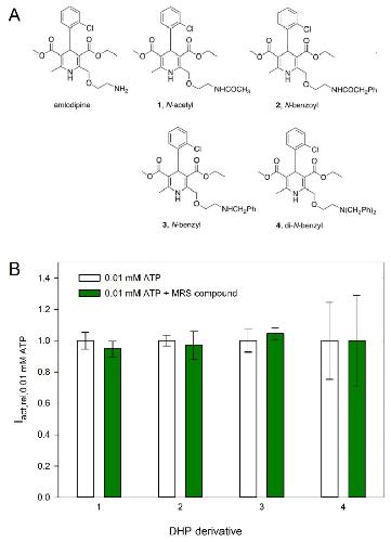 Figure 7. Effects of amlodipine-derived compounds on hP2X5FL-mediated currents. (A) Structures of amlodipine and four newly synthesized DHPs derived from amlodipine. (B) Statistics of the effect of the MRS compounds shown in A. Means are from of 7–9 oocytes.