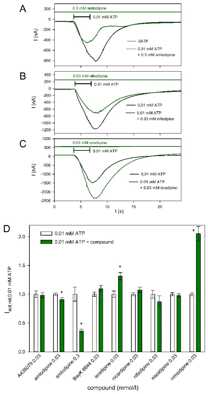 Figure 5. Effect of different dihydropyridines and the P2X7-specific blocker A438079 on hP2X5FL-mediated currents. Examples of the inhibitory effect of amlodipine (A) the effect of nifedipine (B) and the stimulatory effect of isradipine (C) on ATP-induced currents. Currents were evoked by ATP in bathing solution and 2 min later in bathing solution supplemented with the indicated dihydropyridine derivative. (D) Summary of the effects of A438079 and various dihydropyridines on ATP-induced currents. Means are normalized to the mean value of the currents measured during the second ATP application without additional substances (control). Means of 9–50 oocytes. Values that differ significantly from the ATP-only control are marked by asterisks.
