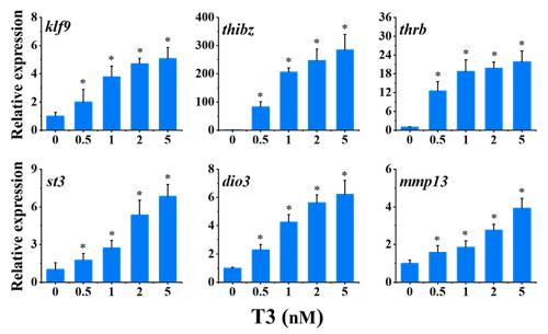 Figure 1. Relative expression of thyroid hormone (TH)-response genes in stage 48 Xenopus tadpoles following 24-h exposure to T3. Data are shown as mean ± SEM (n = 3). * indicates significant differences between T3 exposure and the control (p < 0.05). klf9: Kruppel-like factor 9; thibz: thyroid hormone induced bZip protein; thrb: thyroid hormone receptor beta; st3: stromelysin-3; dio3: type 3 deiodinase; mmp13: matrix metallopeptidase 13.