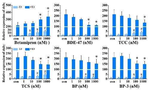 Figure 3. Relative expression of thibz (thyroid hormone induced bZip protein) in stage 48 Xenopus tadpoles following 24-h exposure to betamipron, 2,2′,4,4′-tetrabromodiphenyl ether (BDE-47), triclocarban (TCC), triclosan (TCS), benzophenone (BP), and benzophenone-3 (BP-3) in the absence or presence of 1 nM T3. Data are shown as mean ± SEM (n = 3). * and # indicate significant differences between the chemical exposure and the control and between chemical + T3 and T3 treatment, respectively (p < 0.05).