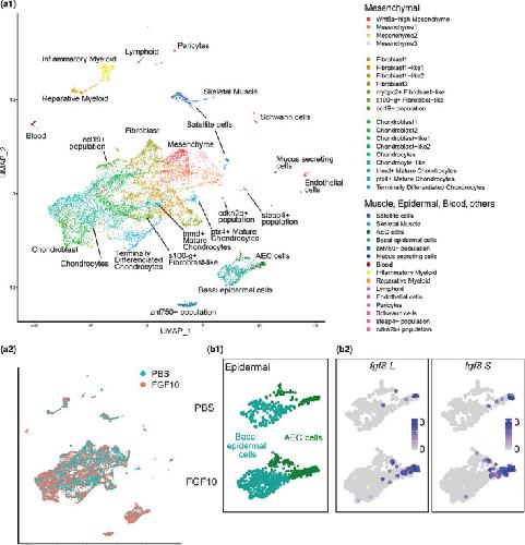 Figure 1. Single-cell transcriptomics on the FGF10-treated and PBS-treated hindlimb blastemas. (a1-2) UMAP plot of cells detected in the scRNA-seq. (a1) cells from the FGF10-treated and PBS-treated samples were combined and divided into 35 clusters depending on the similarity of the gene expression profiles in each cell. Colors indicate cluster identity. Expression profiles of several marker genes in each cluster are shown in Figure S2. (a2) UMAP plot with colors indicating sample condition. (b1-2) The scRNA-seq data showed expansion of the AEC cluster and fgf8-expressing cells in the FGF10-treated sample. (b1) UMAP plot of the AEC and basal epidermal cell clusters of the PBS-treated (top) and FGF10-treated (bottom) samples. (b2) Normalized expression levels (transcripts per 104) of fgf8.L and fgf8.S in the epidermal clusters of each cell of the PBS-treated (top) and FGF10-treated (bottom) samples are plotted in natural-log transformed scale shown by color depth of blue.