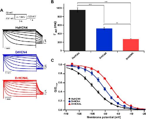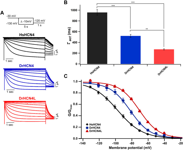 FIGURE 1. Zebrafish HCN4 channels are hyperpolarization-activated ion channels. (A) Representative currents of the human HCN4 channel HsHCN4 (black) and zebrafish HCN4 channels DrHCN4 (blue) and DrHCN4L (red). The holding potential was stepped from −30 mV to −130 mV in 10-mV decrements and held for 5 s at each potential. The inset shows the stimulation protocol. (B) Time constants obtained by fitting the activating currents of HsHCN4 (black), DrHCN4 (red) and DrHCN4L (blue) at −130 mV. (C) Activation curves (G–V curves) of human and zebrafish HCN4 channels (n = 5 for each).