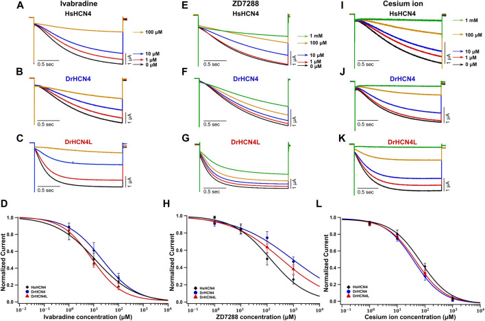 FIGURE 4. Sensitivities of DrHCN4 and DrHCN4L to HCN inhibitors. (A–C) Representative current traces sequentially applied with 0–100 µM of ivabradine. The holding potential was −30 mV and was hyperpolarized to −120 mV for 2 s. (D) Ivabradine inhibition curves based on currents of (A–C). DrHCN4 (blue; n = 5), DrHCN4L (red; n = 4) and HsHCN4 (black; n = 4). (E–G) Representative current traces sequentially applied with 0 μM–1 mM of ZD7288. The holding potential was −30 mV and was hyperpolarized to −120 mV for 2 s. (H) ZD7288 inhibition curves based on currents of (E–G). DrHCN4 (blue; n = 5), DrHCN4L (red; n = 5) and HsHCN4 (black; n = 5). (I–K) Representative currents sequentially applied with 0 μM–1 mM of cesium ion. The holding potential was −30 mV and was hyperpolarized to −120 mV for 2 s. (L) Cesium ion inhibition curves based on currents of (I–K). DrHCN4 (blue; n = 5), DrHCN4L (red; n = 5) and HsHCN4 (black; n = 5).