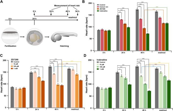FIGURE 5. HCN inhibitors reduce heart rate in developing zebrafish embryos. (A) Experimental method. Inhibitors were administered in the egg water at 24 hpf, and this time point was designated as “0 h”. After administering the inhibitors, heart rate was measured at 24 h (24 h) and 48 h (48 h). Zebrafish were then transferred back to the inhibitor-free egg water, and their heart rates were measured 6 h later (washout). (B) Changes in heart rate with time in zebrafish before (control; grey; n = 10) and after treatment with 1 mM cesium ion (pink; n = 10), ZD7288 (orange; n = 10) and ivabradine (green; n = 10) inhibitors. Heart rates before (0 h) and at 24 h (24 h) and 48 h (48 h), after application of the inhibitors and at 6 h after washing out the inhibitors (washout) are shown as bar graphs. Dunnett’s test was used for statistical analysis, and Student’s t-test was used to compare before and after “washout.” (C) Changes in heart rate with time in zebrafish treated with ZD7288 before (gray; n = 10) and after treatment with 10 μM (light orange; n = 10), 100 μM (orange; n = 10), and 1 mM (dark orange; n = 10). Dunnett’s test was used for statistical analysis, and Student’s t-test was used to compare before and after washout. (D) Changes in heart rate with time in zebrafish treated with ivabradine before (gray; n = 10) and after treatment with 10 μM (thin green; n = 10), 100 μM (light green; n = 10) and 1 mM (dark green; n = 10). Dunnett’s test was used for statistical analysis, and Student’s t-test was used to compare before and after washout.