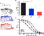 FIGURE 3. DrHCN4 and DrHCN4L can form a heterotetrametric channel. (A) Representative current traces of a mixture of DrHCN4 and DrHCN4L mRNA. The mixed mRNA concentrations were 1:1 (green) and 3:1 (light green). Membrane potential was varied from −30 mV to −130 mV in 10-mV decrements and held for 5 s at each potential. The inset shows the stimulation protocol. (B) Activation curves of the mixed channels of DrHCN4 and DrHCN4L. The mixed mRNA concentrations were 1:1 (green) and 3:1 (light green). Blue and red curves are the activation curves of DrHCN4 and DrHCN4L, respectively. The Boltzmann function fits the activation curves (n = 5). All data are from the same batch of oocytes. Therefore, the data sets of DrHCN4 and DrHCN4L are different from the datasets used in Figures 1, 2. (C) Representative current traces of a dominant-negative mutant with or without wild-type DrHCN4 or DrHCN4L. From top to bottom: DrHCN4 mutant (DrHCN4AAA) only, DrHCN4 (wild-type) + DrHCN4AAA, DrHCN4L (wild-type) + DrHCN4AAA. Wild-type and mutant cRNAs were mixed in a 1:1 ratio with 5 ng each. (D) Averaged current amplitudes at −100 mV were plotted as bar graphs [n = 5 for each except DrHCN4AAA alone (n = 4)].