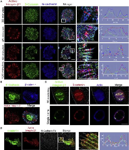 Figure 1. Adherens junctions spatially guide integrin β1 activation (A) Confocal images of interphase HeLa cells fixed at different time points (30, 45, 60, and 120 min) after seeding on N-Cadherin Fc substrates. AJs were stained with β-catenin and N-Cadherin antibodies, while integrin activation was detected with the use of the extended conformation-specific integrin antibody 9EG7. Profiles were generated along the red arrow lines shown in the zoomed images. (B) Confocal image of interphase HeLa cell transfected with E-Cadherin GFP seeded on E-Cadherin Fc substrate. (C) Cell doublet formed on Poly-L-Lysine substrate. Top row shows three-dimensional rendering images of the cell doublet, while the second row shows a single optical section. (D) HeLa cell plated on N-Cadherin Fc micro-patterned substrates. The profile was generated perpendicular to the N-Cadherin Fc stripes. Scale bars, 10 μM. |