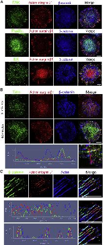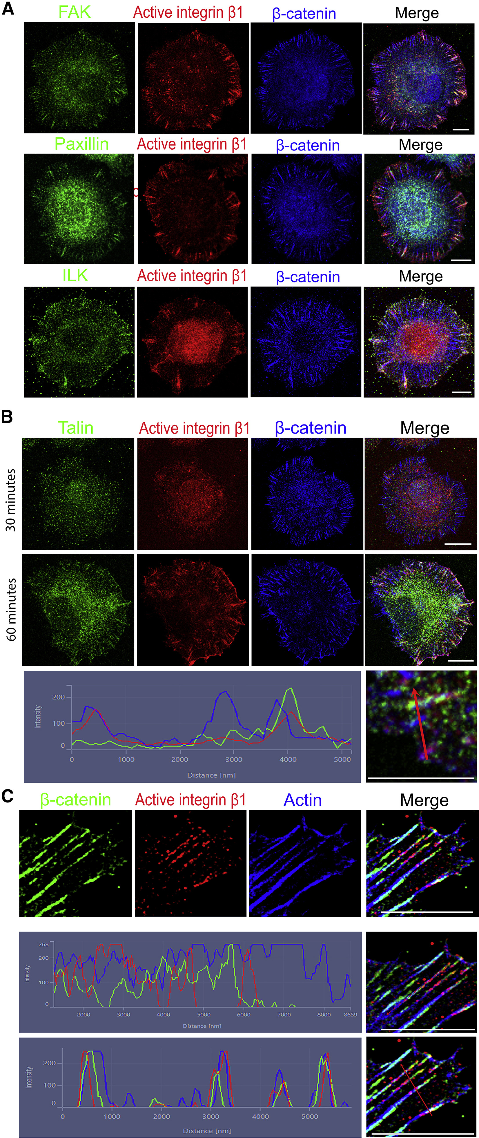 Figure 2. AJ-associated integrin activation promotes the recruitment of FA proteins leading to the formation of hybrid adhesions (A) Representative confocal images of interphase HeLa cells on N-Cadherin Fc substrate after 60 min, stained for FAK, Paxillin, and ILK, respectively. (B) Representative images of cells on N-Cadherin Fc at 30 and 60 min, stained for Talin, active integrin β1 (9EG7), and β-catenin. (C) Super-resolution image of an interphase HeLa cell on N-Cadherin Fc substrate at 60 min, stained for β-catenin, active integrin β1, and actin. The image was background subtracted and deconvolved. Scale bars, 10 μM. |