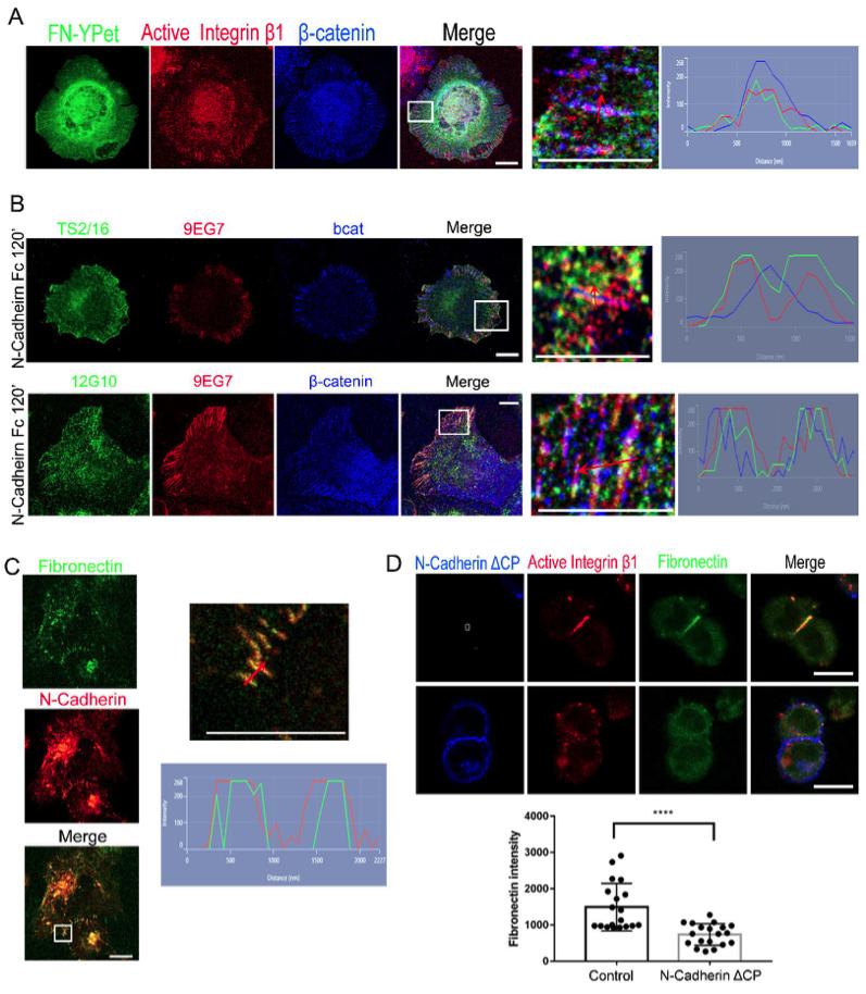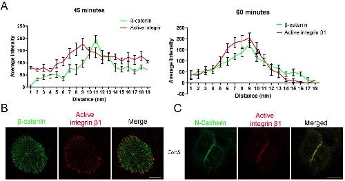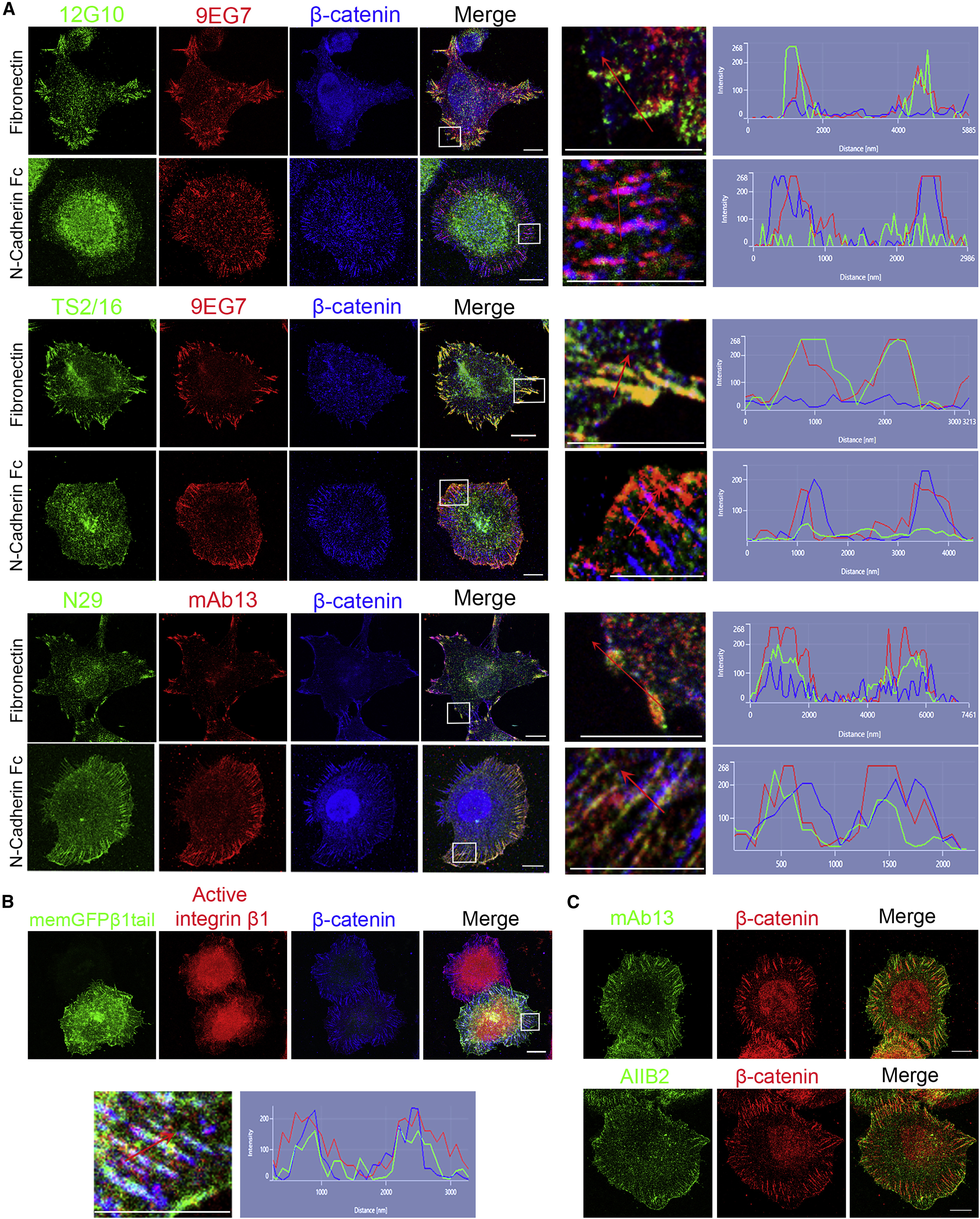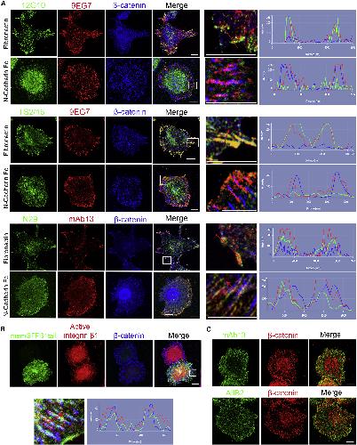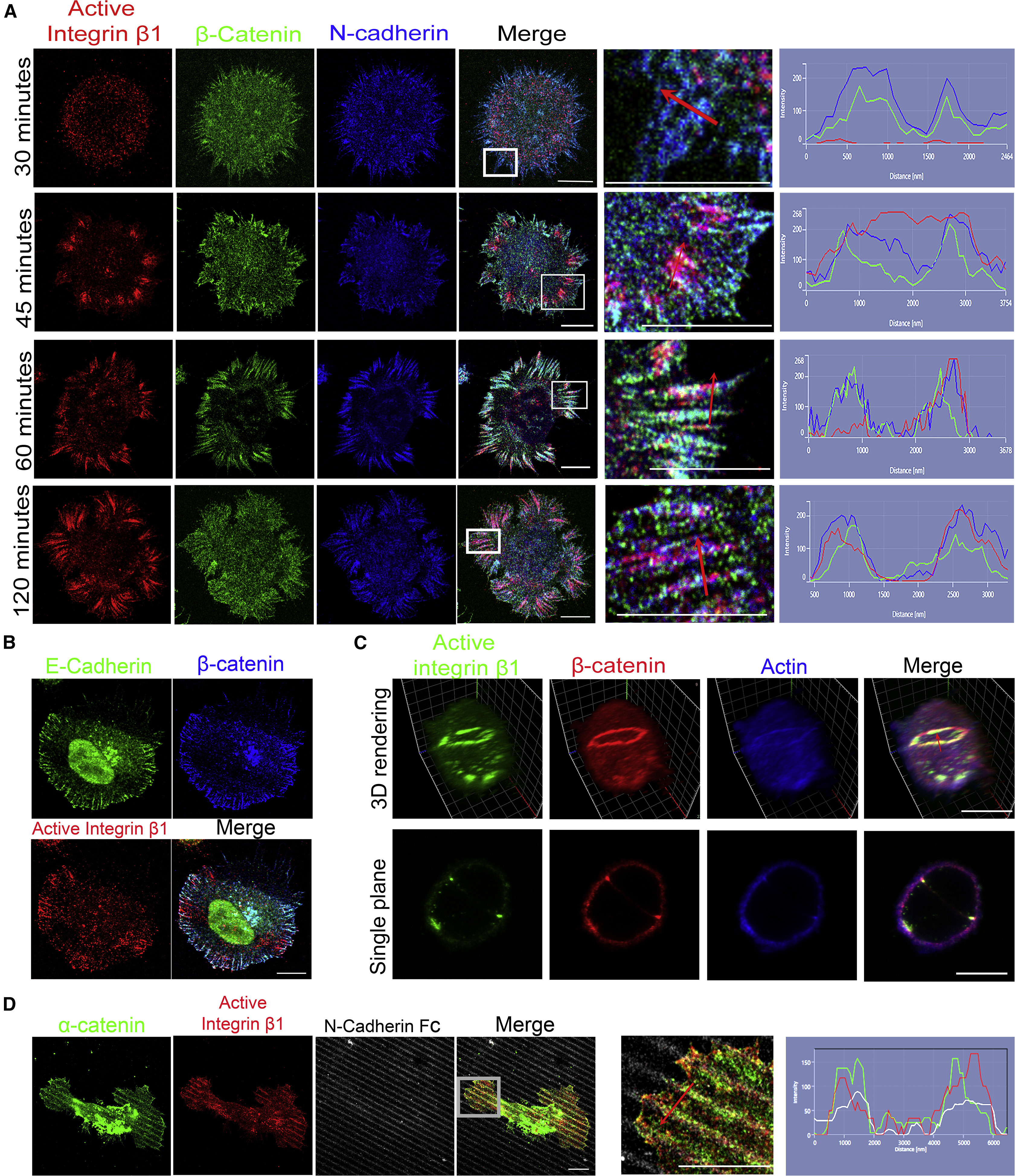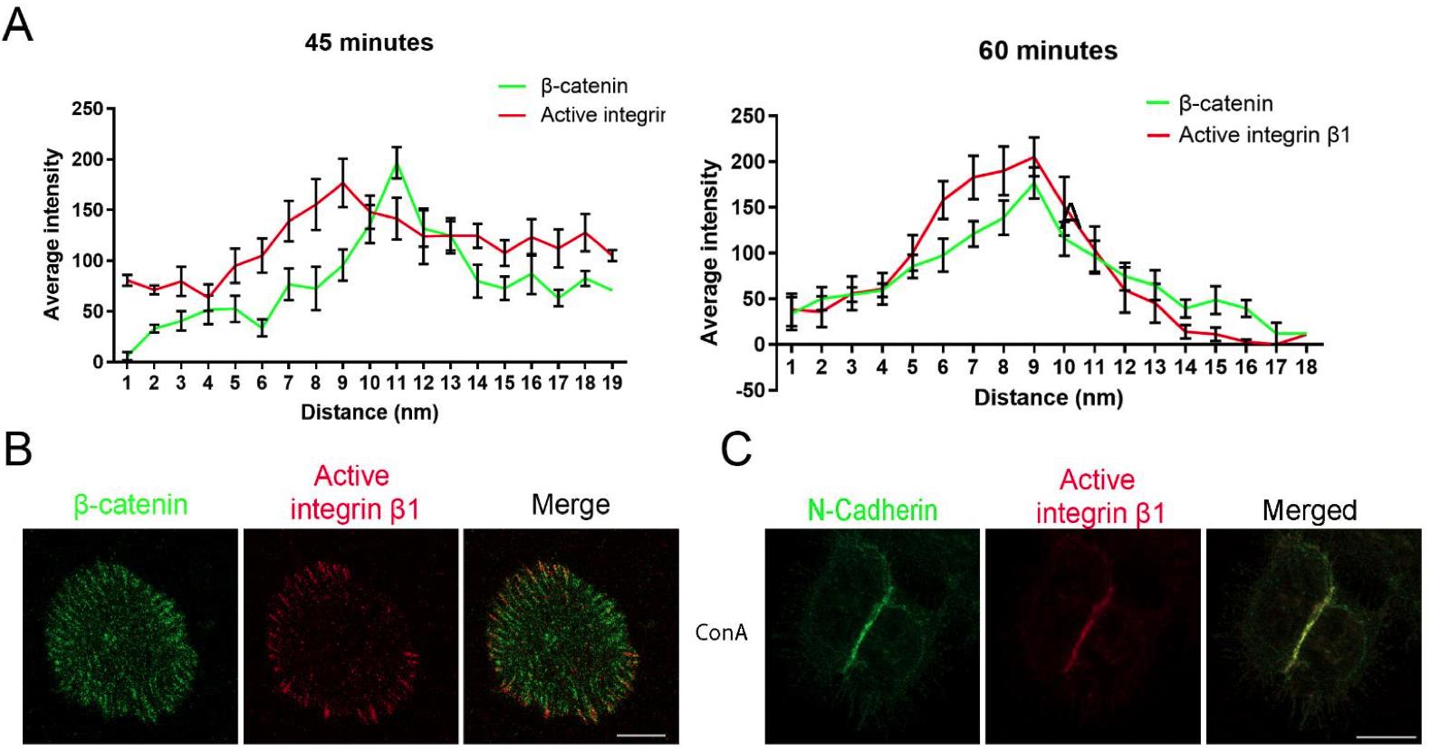 Figure S1. Cadherins and active integrins colocalize under physiological contexts. Related to Figure 1. (A) Representative graphs of multiple profiles collectively of profiles generated by individual AJs of cells seeded on N-Cadherin Fc at the 45-minute and 60-minute time points. (B) U2OS cells seeded on E-Cadherin Fc substrate fixed at 60 minutes. (C) HeLa cells seeded on Concanavalin A coated glass, stained for N-Cadherin and active integrin β1 (9EG7). Scale bars, 10μM. |