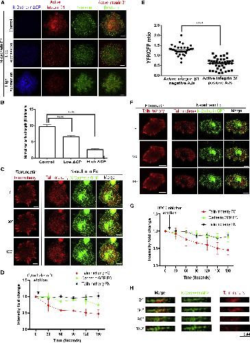 Figure 4. Cadherin clustering and actomyosin contractility are necessary for AJ-driven integrin activation (A) Representative confocal images of HeLa cells expressing different levels of N-Cadherin DCP (control, low, and high expressors) on N-Cadherin Fc substrate 60 min after seeding. Scale bars, 10 μM. (B) Graph shows active integrin β1 fluorescence intensity on hybrid adhesions in cells with different expression levels of N-Cadherin DCP GFP, on N-Cadherin Fc substrate. Means ± SEM: control cells active integrin β1: 10.158 ± 1.492 (n = 70), moderate expressor cells active integrin β1: 6.783 ± 1.285 (n = 70), high expressor cells active integrin β1: 2.739 ± 0.991 (n = 70). Statistical analysis was carried out using the Mann-Whitney test (∗∗∗∗p < 0.0001). n, number of hybrid adhesions measured from three independent experiments. (C) Still images from a time-lapse recording of HeLa cells plated on FN or N-Cadherin Fc substrates before and after the addition of Cytochalasin D. Scale bars, 10 μM. (D) Graph shows fluorescence intensity of Talin mCherry and N-Cadherin GFP over time on FN and N-Cadherin Fc substrates upon Cytochalasin D addition. (E) Scatterplot showing the ratio of YFP/CFP in cells displaying active integrin β1 at individual adhesion compared with cells displaying no active integrin β1. Each point represents an individual adhesion. Active integrin β1 negative AJs: 1.282 ± 0.0252 (n = 45), active integrin β1 positive AJs: 0.6204 ± 0.0548 (n = 62). Statistical analysis was carried out using the Mann-Whitney test (∗∗∗∗p < 0.0001). n, number of hybrid adhesions measured from three independent experiments. (F) Still images from a time-lapse recording of HeLa cells plated on FN or N-Cadherin Fc substrates before and after the addition of Y-27632. Scale bars, 10 μM. (G) Graph shows fluorescence intensity of Talin mCherry and N-Cadherin GFP over time on FN and N-Cadherin Fc substrates upon addition of ROCK inhibitor Y-27632. (H) Close up of a single AJ overtime after addition of the ROCK inhibitor Y-27632. Scale bar, 5 μΜ. |