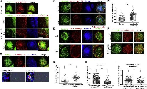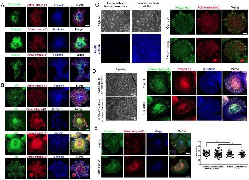 Figure S3. Ligands are not responsible for integrin β1 activation at AJs. Related to Figure 3. (A) Representative confocal images of HeLa cells on N-Cadherin Fc substrate 60 minutes after seeding, stained for several ECM components. (B) Representative confocal images of HeLa cells on N-Cadherin Fc substrate 60 minutes after seeding, stained for several integrin alpha subunits. (C) Representative phase contrast images of cells seeded in the absence (left panel) and presence (right panel) of HFN7.1 anti-fibronectin antibody and Fluorescence images showing binding of the HFN7.1 anti-fibronectin antibody on the fibronectin coated surface (left panel). Right panel shows representative images of cells seeded on N-Cadherin Fc in the absence and presence of the HFN7.1 anti-fibronectin antibody. (D) Left panel shows representative phase contrast images of cells seeded in the absence and presence of GLPG- 0187 αV integrin inhibitor (scale bar=20μM). Right panel shows representative fluorescence images of cells seeded on N-Cadherin Fc in the absence and presence of the GLPG-0187 αV integrin inhibitor (Scale bar=10μÎ). (E) Control and Brefeldin A treated cells on N-Cadherin Fc substrate fixed at 60 minutes, stained for Golgin. Graph shows distribution of fluorescence active β1 integrin intensity between conditions. Means±SEM: Brefeldin A treated: β-catenin, 45,75 ± 0,9588 (n=86); active integrin β1, 46,34 ± 1,361 (n=86); Controls: β-catenin, 45,75 ± 1,108 (n=76); active integrin β1, 44,34 ± 1,0861 (n=76). n, number of hybrid adhesions measured from three independent experiments. Scale bars, 10μM. |