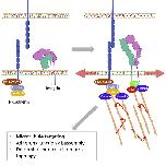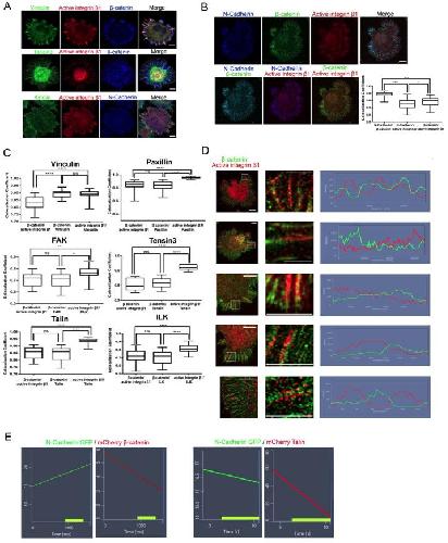 Figure 2. (A) HeLa cells were allowed to attach on N-Cadherin Fc substrates, fixed at 60 minutes and stained for Vinculin, Tensin3 and Kindlin respectively. (B) Confocal image of a HeLa cell on N-Cadherin Fc substrate fixed at 60 minutes. Graphs show the colocalization coefficients between the three proteins (N-Cadherin, β-catenin and active integrin β1). Means±SEM: N-Cadherin/β-catenin, 0,8867 ± 0,004327 (n=55); N-Cadherin/active integrin β1, 0,7479 ± 0,009215 (n=55); β-catenin/active integrin β1, 0,7855 ± 0,008077 (n=55). Data were analysed by Mann-Whitney test (****P<0.0001). n, number of hybrid adhesions measured from three independent experiments. (C) Pairwise colocalization coefficients at individual HAs (Vinculin/ Paxillin/ Tensin3/ FAK/ Talin/ ILK, β-catenin and active integrin β1). Scale bars, 10μM. Vinculin: Means±SEM: β-catenin/active integrin β1, 0,8274 ± 0,008341 (n=34); β-catenin/Vinculin, 0,8929 ± 0,004296 (n=34); active integrin β1/Vinculin, 0,8882 ± 0,005144 (n=34). Data were analysed by paired t-test (****P<0.0001). n, number of hybrid catenin/active integrin β1, 0,8378 ± 0,01883 (n=18); β-catenin/Paxillin, 0,8289 ± 0,001782 (n=18); active integrin β1/Paxillin, 0,9550 ± 0,003259 (n=18). Data were analysed by paired t- test (****P<0.0001). n, number of hybrid adhesions measured from three independent β-catenin/Tensin3, 0,8150 ± 0,008817 (n=14); active integrin β1/Tensin3, 0,9200 ± 0,004804 (n=14); . Data were analysed by paired t-test (****P<0.0001). n, number of hybrid adhesions measured from three independent experiments. FAK: Means±SEM: β-catenin/active integrin β1, 0,8079 ± 0,01105 (n=14); β-catenin/FAK, 0,8150 ± 0,008817 (n=14); active integrin β1/FAK, 0,9200 ± 0,004804 (n=14);. Data were analysed by paired t-test (**P<0.005). n, number of hybrid adhesions measured from three independent experiments. Talin: Means±SEM: β-catenin/active integrin β1, 0,8508 ± 0,008887 (n=25); β-catenin/Talin, 0,8380 ± 0,001033 (n=25); active integrin β1/Talin, 0,9384 ± 0,003497 (n=25);. Data were analysed by paired t-test (****P<0.0001). n, number of hybrid adhesions measured from three independent experiments. ILK: Means±SEM: β-catenin/active integrin β1, 0,7216 ± 0,01521 (n=31); β-catenin/ILK, 0,7010 ± 0,01445 (n=31); active integrin β1/ILK, 0,8116 ± 0,008921 (n=31); Data were analysed by paired t-test (****P<0.0001). n, number of hybrid adhesions measured from three independent experiments. (D) Deconvolved confocal images of HeLa cells on N-Cadherin Fc, showing the different spatial relationships of β-catenin and active integrin β1 within individual hybrid adhesions. (E) Acceptor photobleaching carried out on HeLa cells attached on N-Cadherin Fc substrates shows that FRET takes place between N- Cadherin and β-catenin, but not between N-Cadherin and Talin, confirming the lack of adhesions measured from three independent experiments. Paxillin: Means±SEM: β- experiments. Tensin3: Means±SEM: β-catenin/active integrin β1, 0,8079 ± 0,01105 (n=14); interaction and spatial segregation of the receptors in hybrid adhesions. Cells were transfected with either N-Cadherin GFP and Talin mCherry or N-Cadherin GFP and β-catenin mCherry. An individual AJ in each case was selected and bleached with the use of a 568 nm laser. Scale bars, 10μM. |