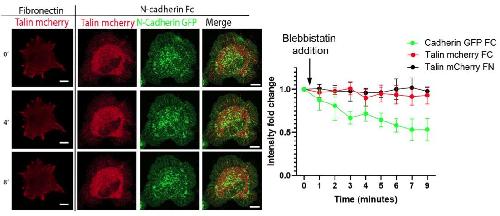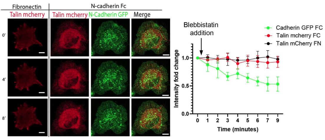 Figure S5. Actomyosin contractility is necessary for integrin activation at AJs. Related to Figure 4. Still images from a time-lapse recording of HeLa cells seeded on FN or N-Cadherin Fc substrates before and after the addition of Blebbistatin. The graph shows fluorescence intensity of Talin mCherry and N-Cadherin GFP overtime on Fibronectin and N-Cadherin Fc substrates upon addition of Blebbistatin. Scale bars, 10μM. |