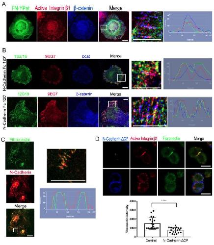 Figure S7. AJs spatially guide ECM deposition in vitro. Related to Figure 7. (A) HeLa cell transfected with YPet-FN seeded on N-Cadherin Fc substrate, fixed at 60 minutes. Profile generated is perpendicular to the YPet-FN positive AJ. (B) Representative images of HeLa cells fixed at 120 minutes on N-Cadherin Fc substrate, stained for open headpiece conformation specific integrin β1 antibodies 12G10 and TS2/16. Scale bars, 10μM. (C) Cells seeded on glass substrates in the presence of YPet-FN. Profile was generated perpendicular to two AJs at cell-cell contact. (D) Representative confocal images of a control cell doublet and a doublet expressing N-Cadherin DCP and graph of the distribution of Fibronectin fluorescence intensity between control and N-Cadherin ÎCP expressing cells. Means±SEM: control doublets, 1494 ± 150,4 (n=19); N-Cadherin DCP doublets, 737,5± 69,09 (n=19). Statistical analysis was carried out using the MannâWhitney test (ns, P=0,4567). n, number of doublets measured from three independent experiments. Scale bars, 10μM. |