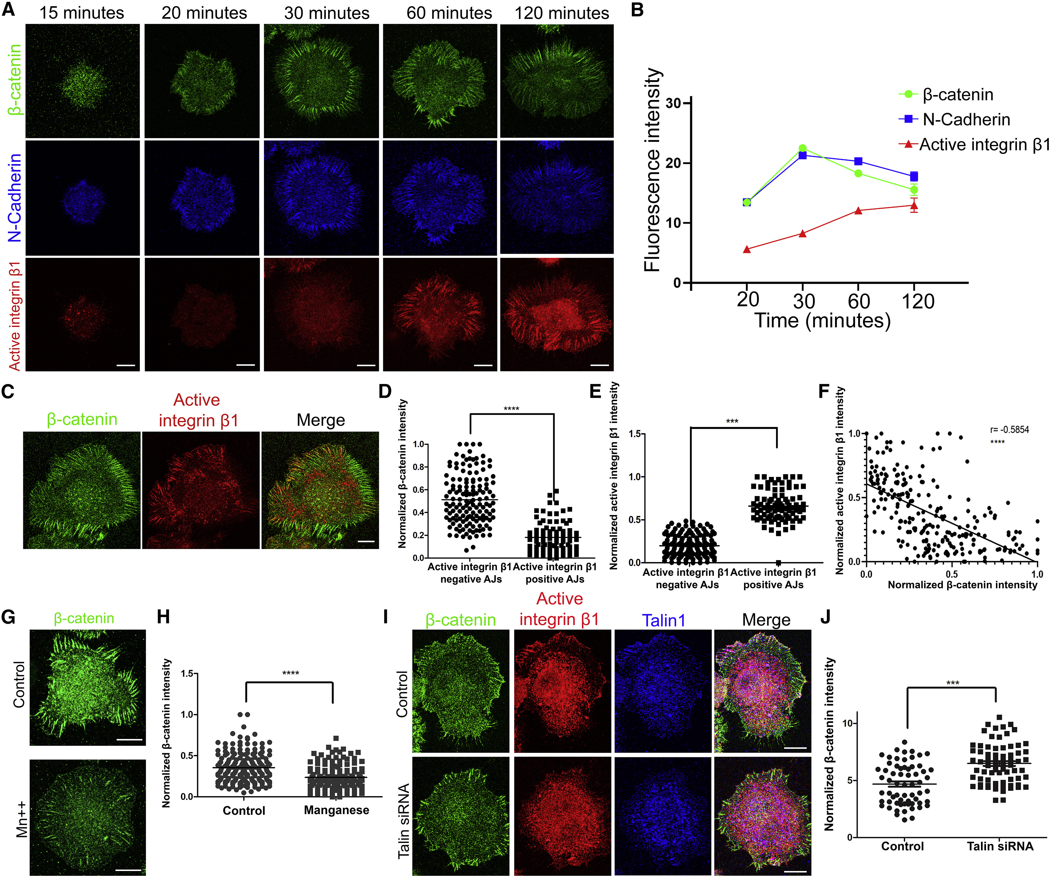 Figure 5. Integrin activation promotes AJ disassembly (A) Confocal images of HeLa cells on N-Cadherin Fc substrate, fixed at different time points (12, 20, 30, 60, and 120 min). (B) Graph of average fluorescence intensity of β-catenin, N-Cadherin and active integrin β1 over time. (C) Image of HeLa cell seeded on N-Cadherin Fc substrate displaying polarized integrin activation and polarized AJ disassembly. (D) β-catenin normalized intensity on integrin β1-positive and -negative AJs. Means ± SEM: β1 negative AJs, 0.5132 ± 0.01843 (n = 142); β1 positive AJs, 0.1823 ± 0.01420 (n = 89). Statistical analysis was carried out using the Mann-Whitney test (∗∗∗∗p < 0.0001). n, number of hybrid adhesions measured from three independent experiments. (E) Active integrin β1 normalized intensity between integrin β1-positive and -negative AJs. Means ± SEM: β1 negative AJs, 0.1987 ± 0.01016 (n = 146); β1-positive AJs, 0.6599 ± 0.01875 (n = 91). Statistical analysis was carried out using the Mann-Whitney test (∗∗∗∗p < 0.0001). n, number of hybrid adhesions measured from three independent experiments. (F) Scatterplot of active integrin β1 normalized intensity in relation to β-catenin normalized intensity in individual AJs. N = 234, (∗∗∗∗p < 0.0001); r = 0,5854, n, number of hybrid adhesions measured from three independent experiments. (G) Representative confocal images of control and Mn2++ treated cells, plated on N-Cadherin Fc substrate for 60 min. (H) Graph showing the β-catenin normalized intensity on the AJs of control and Mn2++ treated cells on N-Cadherin Fc substrates. Means ± SEM: control cells, 0.3540 ± 0.01347 (n = 182); Mn2++ treated cells, 0.2354 ± 0.01231 (n = 143). Statistical analysis was carried out using the Mann-Whitney test (∗∗∗∗p < 0.0001). n, number of hybrid adhesions measured from three independent experiments. (I) Representative images of control cells and cells transfected with siRNA against Talin, plated on N-Cadherin Fc substrate for 60 min. (J) Graph showing the β-catenin normalized intensity on AJs between the two conditions. Means ± SEM: control cells, 4.679 ± 0.2262 (n = 63); Talin siRNA transfected cells, 6.482 ± 0.2047 (n = 73). Statistical analysis was carried out using the Mann-Whitney test (∗∗∗∗p < 0.0001). n, number of adherens junctions measured from three independent experiments. Scale bars, 10 μM. |