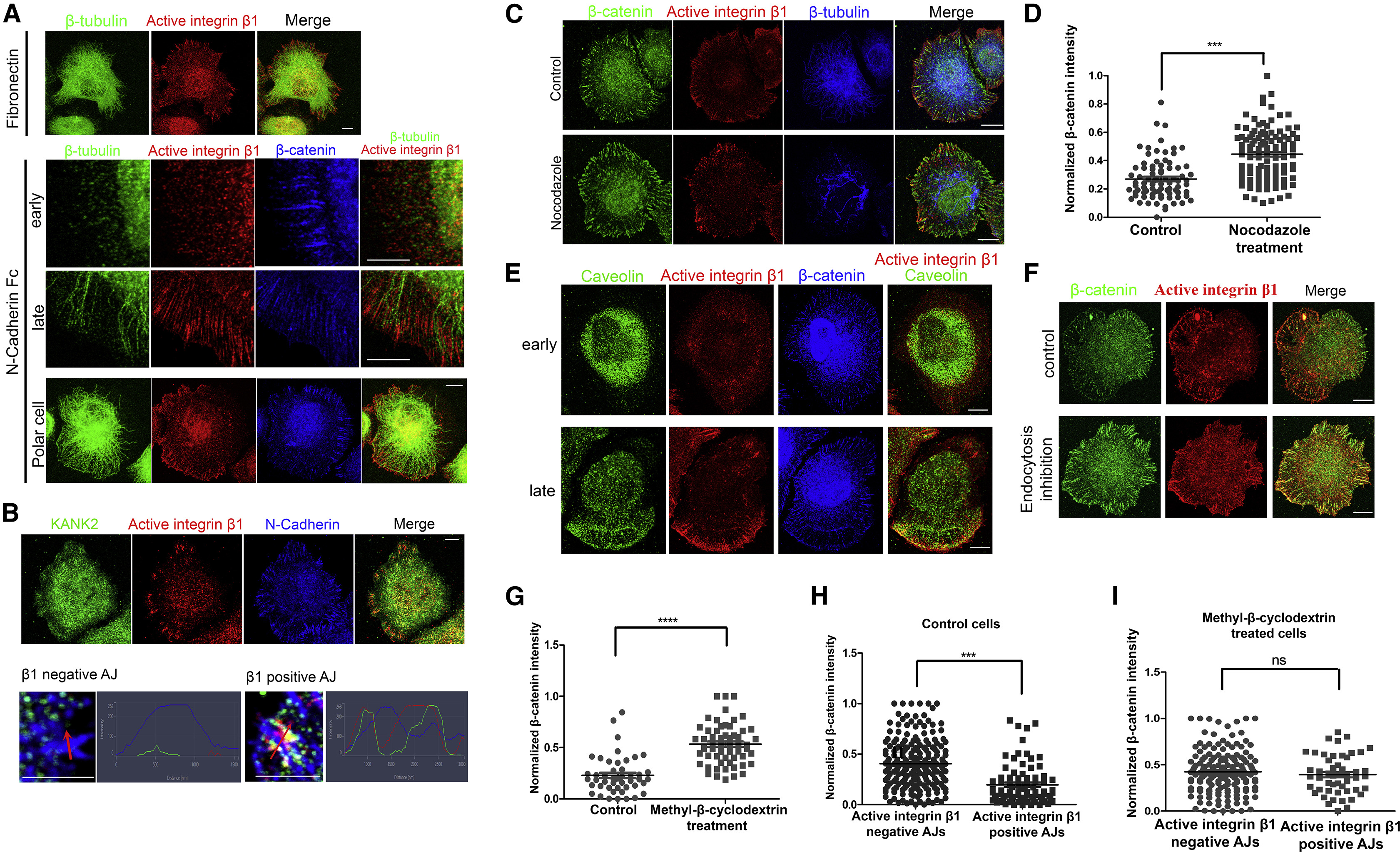 Figure 6. Integrin activation leads to AJ disassembly in a caveolar endocytosis- and microtubule-dependent manner (A) Confocal images of HeLa cells on FN and N-Cadherin Fc substrates (fixed at 30 min and 60 min) stained for β-tubulin, β-catenin, and active integrin β1. (B) HeLa cells fixed at 60 min and stained for KANK2, N-Cadherin, and active integrin β1. Profiles were generated perpendicular to the β1-negative and β1-positive adherens junctions. (C) Representative images of control versus Nocodazole-treated HeLa cells plated on N-Cadherin Fc for 60 min. (D) Graph shows the distribution of β-catenin normalized intensity in control and Nocodazole-treated cells. Means ± SEM: control cells, 0.2700 ± 0.01634 (n = 81); Nocodazole-treated cells, 0.4451 ± 0.01712 (n = 112). Statistical analysis was carried out using the Mann-Whitney test (ââââp < 0.0001). n, number of hybrid adhesions measured from three independent experiments. (E) HeLa cells fixed at 60 min and stained for caveolin, β-catenin, and active integrin β1. (F) Confocal images of control and Methyl-β-Cyclodextrin-treated HeLa cells on N-Cadherin Fc substrates fixed at 60 min. (G) Graph of the distribution of β-catenin normalized intensity between control and Methyl-β-Cyclodextrin-treated cells. Means ± SEM: control cells, 0.295 ± 0.02652 (n = 47); Methyl-β-Cyclodextrin-treated cells, 0.5328 ± 0.02652 (n = 57). Statistical analysis was carried out using the Mann-Whitney test (ââââp < 0.0001). n, number of hybrid adhesions measured from three independent experiments. (H) β-catenin normalized intensity in β1-negative and β1-positive AJs in control cells. Means ± SEM: β1-negative AJs, 0.4059 ± 0.01638 (n = 212); β1-positive AJs, 0.1972 ± 0.02180 (n = 82). Statistical analysis was carried out using the Mann-Whitney test (ââââp < 0.0001). n, number of hybrid adhesions measured from three independent experiments. (I) β-catenin normalized intensity in β1-negative and β1-positive AJs in Methyl-β-Cyclodextrin-treated cells. Means ± SEM: β1-negative AJs, 0.4248 ± 0.01878 (n = 158); β1-positive AJs, 0.3933 ± 0.02931 (n = 51). Statistical analysis was carried out using the Mann-Whitney test (ns, p = 0.4567). n, number of hybrid adhesions measured from three independent experiments. Scale bars, 10 μM. |