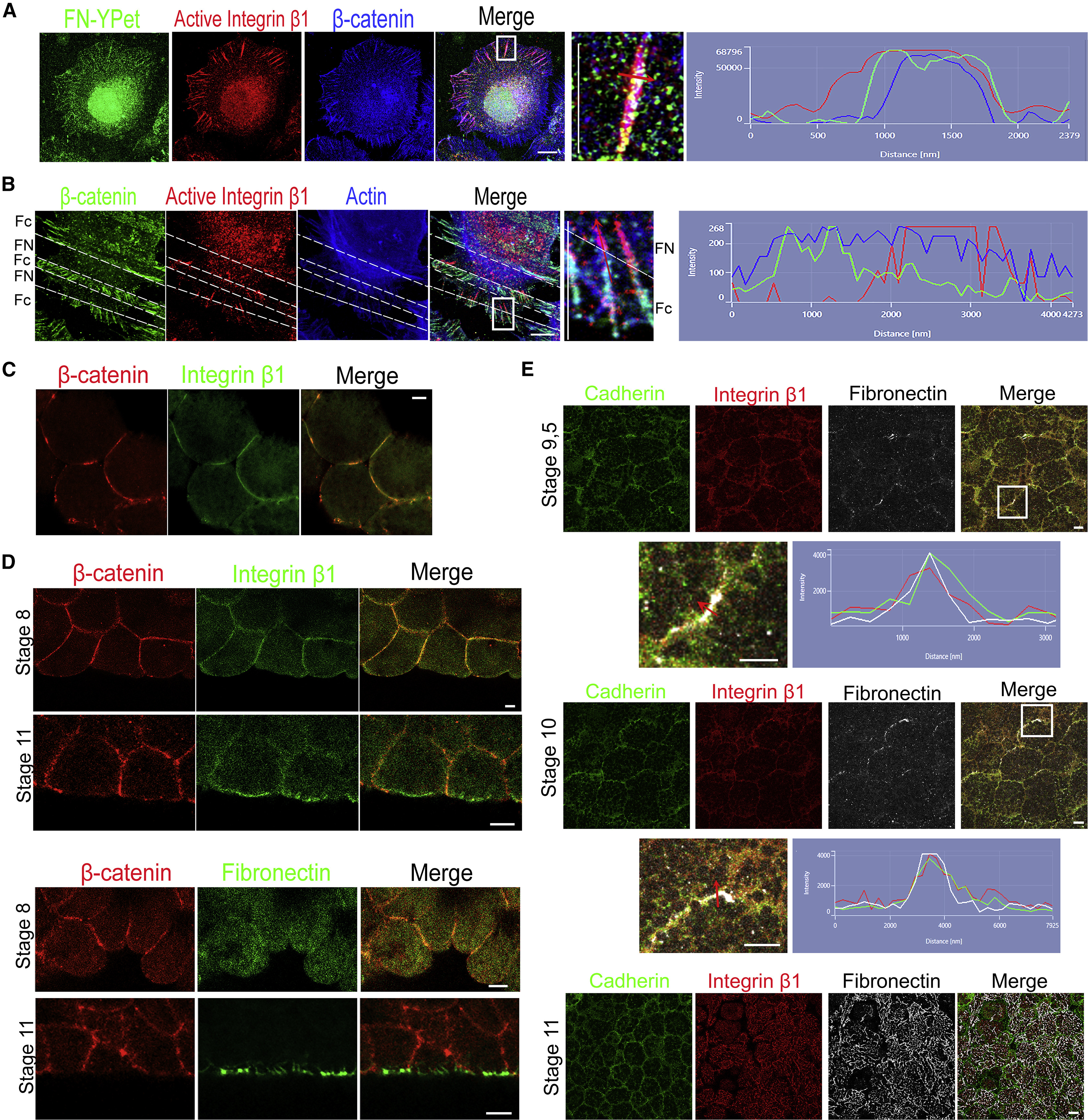 Figure 7. AJ topology influences integrin distribution and ligand deposition (A) HeLa cell spread on N-Cadherin Fc fixed at 60 min. Soluble YPet-FN was introduced in the medium at 60 min. Profile generated is perpendicular to the YPet-FN-positive AJ. (B) Confocal image of HeLa cell spread on FN/N-Cadherin Fc stripes. Dashed lines indicate the limits between Fibronectin and N-Cadherin Fc stripes. Scale bars, 10 μM. (C) Interstitial space in the blastocoel roof of stage 8 embryo stained for β-catenin and Integrin β1. (D) Sagittal sections of the blastocoel roof of stage 8 and 11 embryos stained for β-catenin/Integrin β1 or β-catenin/Fibronectin. (E) Animal caps of stage 9.5, 10, and 11 stained for E-Cadherin, Fibronectin and Integrin β1. Profiles were generated perpendicular to the fibrils. Scale bars, 10 μM. |