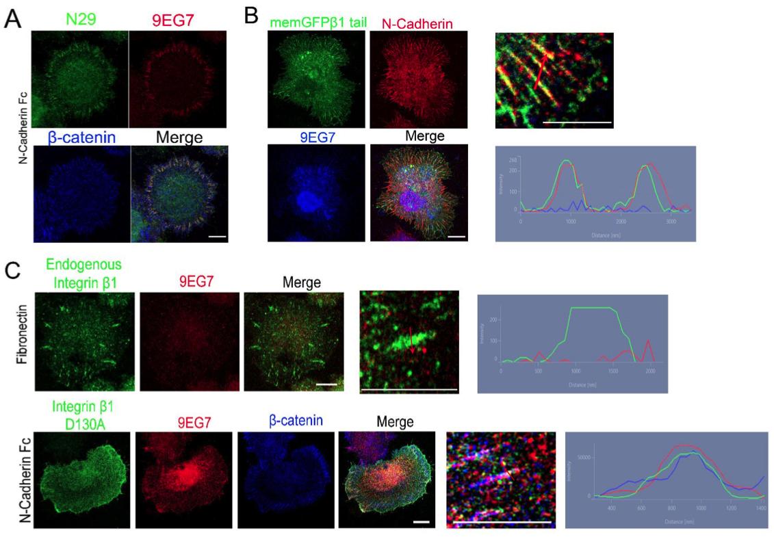 Figure S4. Ligand binding is dispensable for integrin activation at AJs. Related to Figure 3. (A) Representative image of a cell 60 minutes after seeding on N-Cadherin Fc, stained with two extended conformation specific integrin β1 antibodies, 9EG7 and N29. (B) HeLa cell transfected with β1 tail GFP construct on N-Cadherin Fc. (C) Representative images of control xenopus XL177 cells on Fibronectin and Integrin β1 morphant XL177 cells expressing the D130A mutant on N-Cadherin Fc. Scale bars, 10μM. |