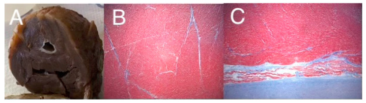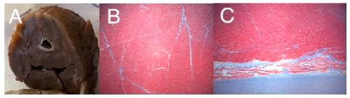 Figure 2. Gross specimen of an explanted heart from a patient with HLHS, with mitral stenosis and aortic stenosis (A), showing a diminutive LV chamber with endocardial fibroelastosis and a thickened LV wall, and trichrome staining from the LV free wall (B), and a luminal biopsy demonstrating severe EFE (C). Images graciously provided by Dr. Denise Malicki, Department of Pathology, Rady Children’s Hospital of San Diego.