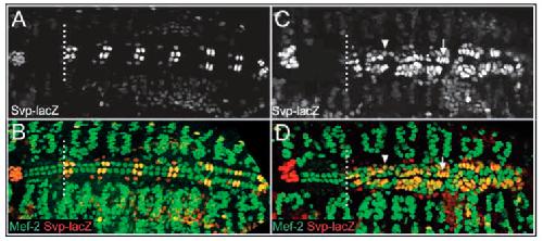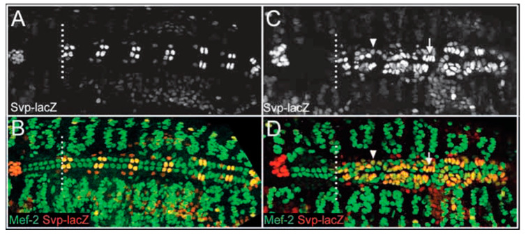 Figure 4. Pointed embryos exhibit a significant increase in Svp-positive cardioblasts. Dorsal views of stage 16 wild-type (A,B) and pnt (C,D) embryos labeled for Svp-lacZ (A,C), and Svp-lacZ and Mef-2 (B,D). (A,B) In wild-type embryos, 12 Svp-negative cardioblasts arise anterior to the first Svp-positive cardioblast (broken white line); seven of these cardioblasts are visible in A and B. Posterior to this location, there is a reiterative pattern of two Svp-lacZ positive cardioblasts (yellow/orange) and four Svp-lacZ negative cardioblasts (green) per hemisegment. (C,D) In pnt embryos, cardioblast development anterior to the first Svp-positive cardioblast (broken white line) appears normal. However, many ectopic cardioblasts are found posterior to this location and the majority of these cells express Svp-lacZ at high (arrow) or moderate levels (arrowhead). The broken white line separates the anterior heart domain from the posterior seven heart segments; anterior is towards the left [5].