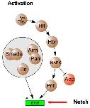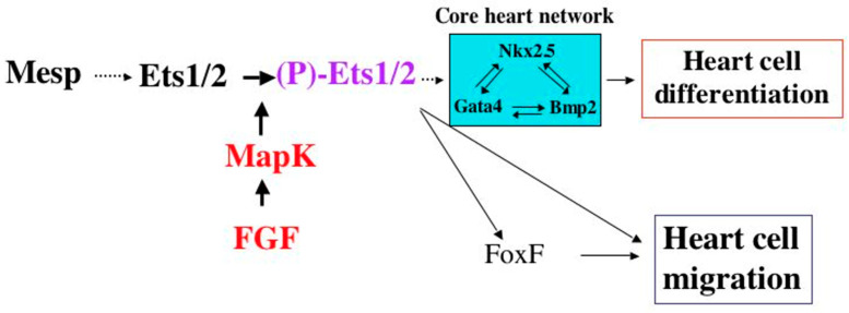 Figure 3. Ciona heart specification network. Schematic diagram depicting the transcriptional core network of genes involved in heart development in Ciona intestinalis. Mutations in at least three of these genes (ETS1, NKX2-5, and FoxF1) have been identified in patients in association with HLHS. (Kindly provided by Dr. Brad Davidson.)