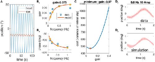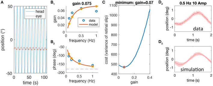 Figure 2. Sequential steps of the methodological approach. (A) Example of raw head (blue) and eye (red) motion data obtained from one animal at a stimulus frequency of 0.1 Hz. (B) gain (B1) and phase values (B2) derived from raw data (blue) for a single animal along with the model simulation of the best fitting model; the gain value for this animal is 0.075. (C) Simulated cost function (retinal image slip variance) plotted with respect to the gain factor using the model derived in (B) for different noise factors; here, the simulation is shown for the optimal gain factor that matches the animal's actual gain factor. (D) Averaged eye position response during rotation at 0.5 Hz for the data (D1) and the simulation (D2); note that the average eye position trace of data and simulation (mean, red line) is similar due to the prior model fitting, but that the variability, which is also similar (shaded red) is a prediction based on the noise level and gain factor.