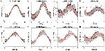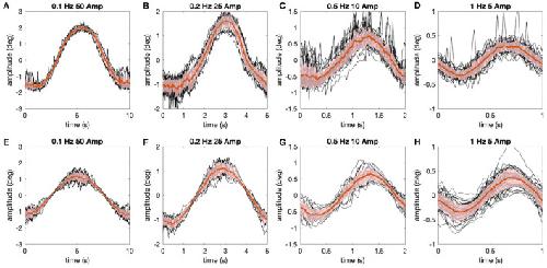 Figure 5. Comparison of experimentally measured and simulated eye movements. (A–H) Eye movements (raw traces in black, red lines show average) shown for all stimulus motion cycles at different stimulus frequencies depicted for the representative animal in Figure 4