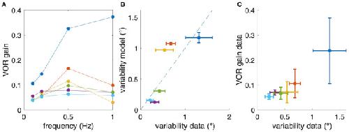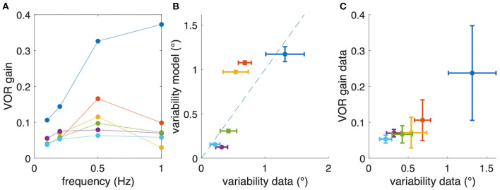 Figure 6. Relation between aVOR gain and variability of eye movements. (A) For comparison, aVOR gain values (see Figure 2) are shown for each animal separately in different colors. (B) Variability of eye movements for each animal plotted with respect to the predicted variability, i.e., the variability of the model simulations. (C) Variability of eye movements for each animal plotted with respect to the aVOR gain. Each data point in (B,C) represents the mean across four stimulus frequencies; error bars denote the standard deviation; note that for the animals depicted in yellow and orange only data for three frequencies were available.