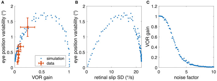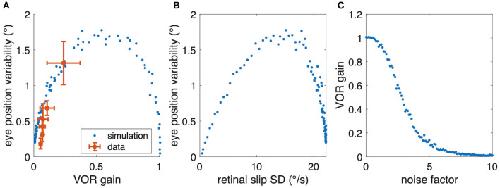 Figure 7. Relation between aVOR gain and variability of eye movements. (A) Replot of data from Figure 6C (red) together with model simulations of the standard aVOR model with varying sensorimotor noise and optimized aVOR gain (all other model parameters kept constant); the model predicts that for low aVOR gain values, the eye position variability will increase with increasing gain values (<0.5), but decrease again for higher values (>0.5). (B) Variability of eye movements for each animal plotted with respect to the retinal image slip [same simulations as in (B)]. (C) Optimal aVOR gain values [model simulations as in (A,B)] decreases with the sensorimotor noise factor.