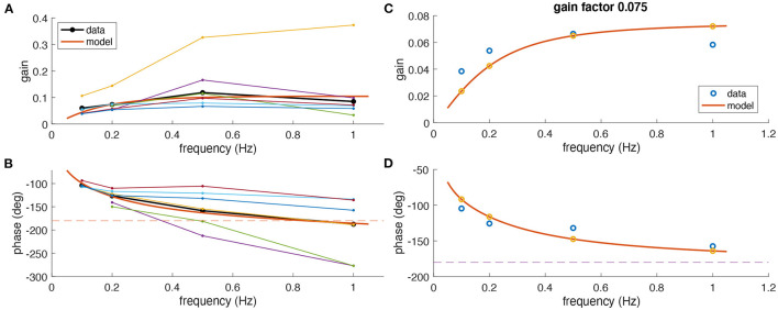 FIGURE 3. Comparison of experimental and modeling data. (A,B) Experimental gain (A) and phase values (B) for eye movements of Xenopus tadpoles (n = 6) (colored small dots) along with average gain and phase values (large black dots); the red curve depicts simulated gain and phase values obtained from the computational model (red line) of the tadpole aVOR that have been fitted to the average results (black); note that an eye movement with a phase shift of â180° [dashed line in (B)] and a gain of 1 would perfectly compensate for the head rotation at all frequencies. (C,D) Example experimental data (blue circles) obtained from one animal (same as in Figure 2) and modeling results (red curve, yellow circles), with gain and phase values plotted in (C,D), respectively.
