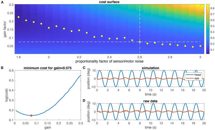 Figure 4. Determination of the noise level. (A) Simulated cost surface [as log (cost)] for one animal (same as in Figures 3C,D) and for eye movements at a stimulus frequency of 0.5 Hz and ±10° head motion amplitude plotted as function of the noise factor of sensorimotor noise and model gain factor; the cost of the aVOR has been quantified by calculating the variance of the retinal image slip; yellow dots indicate the minimum cost for each noise factor; the dashed horizontal line is the experimentally determined gain value, and the vertical dashed line the noise factor at which the optimal gain value is closest to the experimental gain value (2.6 in this case). (B) Section through the cost surface for a noise factor of 2.6; the optimal gain is 0.075, as shown in (A). (C) Simulated eye movements (red) for the optimal gain value determined in (A,B). (D) Raw eye movement recordings (red) for this animal for comparison.