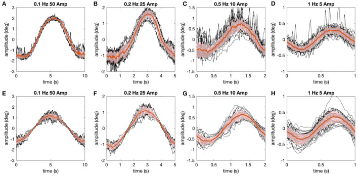 FIGURE 5. Comparison of experimentally measured and simulated eye movements. (AâH) Eye movements (raw traces in black, red lines show average) shown for all stimulus motion cycles at different stimulus frequencies depicted for the representative animal in Figure 4 (AâD), along with corresponding simulations (EâH) of the data using the aVOR model (with appropriately adapted parameters) and optimal gain values to minimize the retinal image slip caused by signal-dependent sensor and motor noise (see also Figure 4); shaded areas indicate one standard deviation of the mean response.