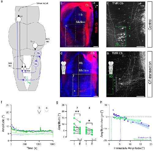 Fig. 3. Anatomical and functional consequences of climbing fiber transection. a Schematic of a Xenopus tadpole brain depicting the direct (black) and indirect (blue) OKR pathways for eliciting a horizontal OKR during rightward motion stimulation of the right eye; the site of climbing fiber transection in the caudal hindbrain is indicated by the green dashed line. b–e Whole-mount confocal reconstructions of the hindbrain (Hb) of a stage 55 control tadpole (b–c) and after midline transection (d–e) at the level of the caudal hindbrain (green line in a, scheme in d) counterstained with DAPI (blue nuclei); unilateral cerebellar injections of Tetramethylrhodamine (TMR; black arrows), outlined the climbing fiber (CF) axonal pathway (green arrow heads in c, e) and parent inferior olivary cell bodies in the contralateral ventral hindbrain in controls (b) and lack thereof after the lesion (* in d), illustrated at higher magnification in c, e (green dashed rectangles); f Population-averaged response amplitudes across 30 min of training, measured on a per-cycle basis for stimulus paradigms 3 and 4, in controls (blue) and after CF transection (green). g Mean response of five cycles obtained immediately (I) and at the end of the 30-min OKR entrainment (E) on a per-animal basis for stimulus paradigms 3 and 4 (see Fig. 1c) in CF-transected animals. h Amplitude changes plotted against immediate OKR amplitudes for controls (blue) and CF-transected animals (green); solid lines indicate linear regression fit to data, and shaded area the 95% confidence interval of the fit; horizontal dotted line indicates no amplitude change; dots above the line indicate amplitude increase, dots below amplitude decrease. Blue (control tadpoles) and green (CF-transected tadpoles) vertical dashed arrows indicate the theoretical initial amplitudes, above or below which a decrease or increase is expected. Abd abducens nucleus, Cb cerebellum, D dorsal, IO inferior olive, L lateral, MN motoneurons, Ocu oculomotor nucleus, Pt pretectum, R rostral, VN vestibular nuclei. Scale bars in all panels represent 100 µm